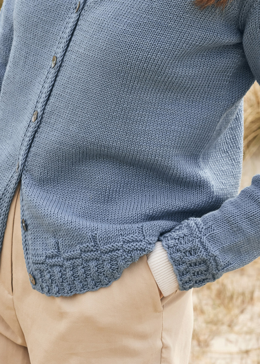 Lana Grossa-Qualität „Cool Wool Seta“ (80% Schurwolle (Merino extrafine), 20% Seide, 160m/50g); 450 (500 - 550 - 600) g Jeans (Fb 3); Stricknadeln Nr. 3 oder 3,5; 6 Knöpfe ca. 15 mm