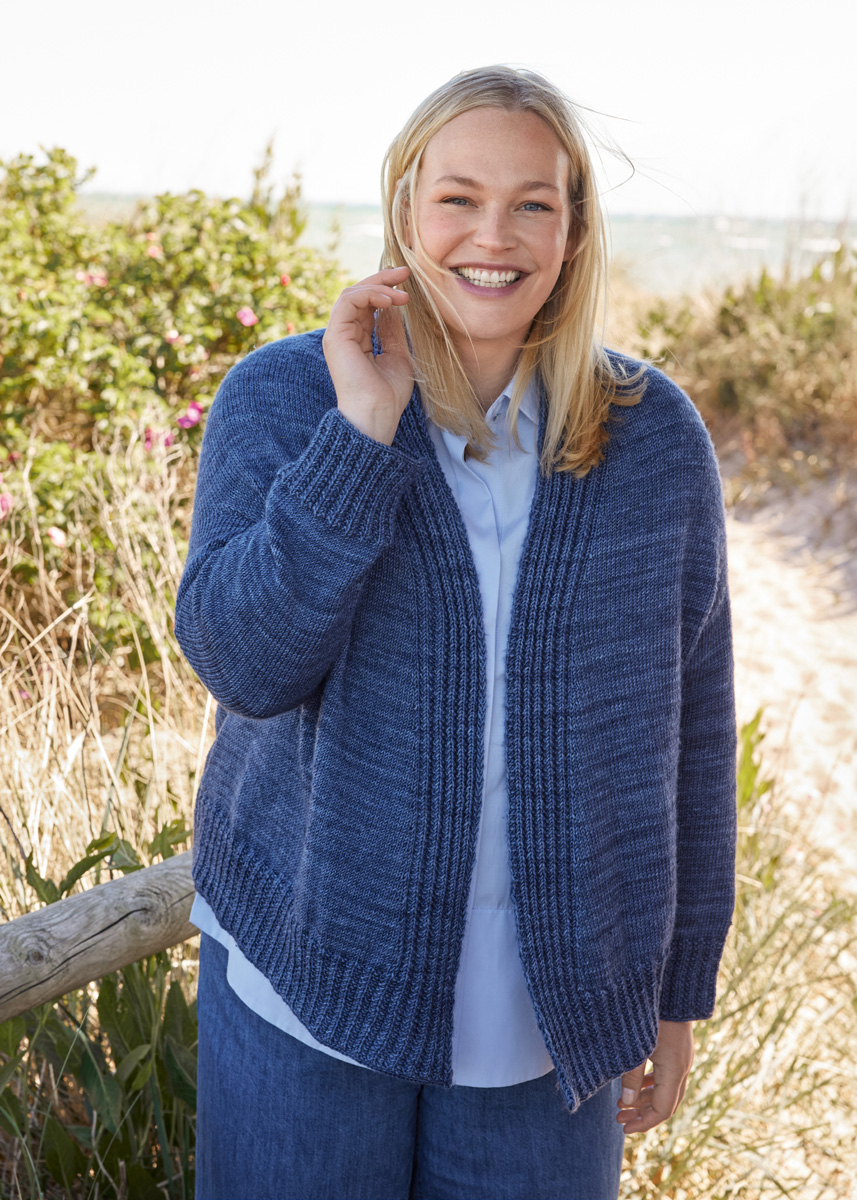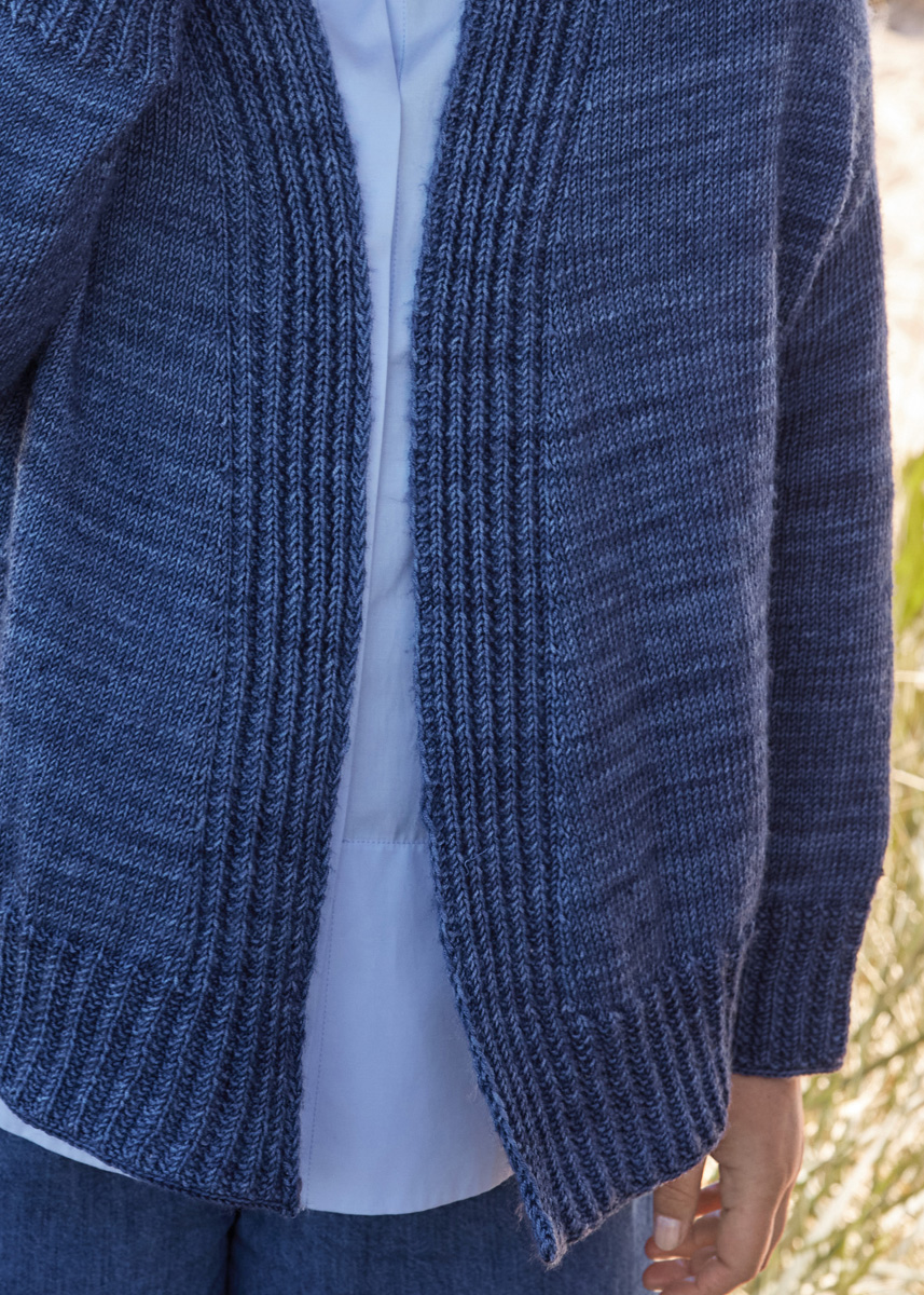 Die Jacke wird in der rückwärtigen Mitte mit einem provisorischen Maschenanschlag mit Hilfsfaden begonnen und nach beiden Seiten hin über die Schultern bis zum unteren Rand der Vorderteile an einem Stück gestrickt. Dann werden noch die Maschen für die unteren Blenden aufgefasst und die Randblenden von Vorder- und Rückenteil gestrickt. Zuletzt werden aus den stillgelegten Maschen für die Ärmel Maschen aufgefasst und die Ärmel von oben nach unten gestrickt.