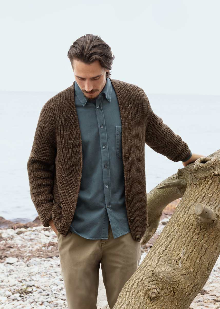 Lana Grossa Cool Wool Vintage (100% Schurwolle (Merino extrafein), Lauflänge 160 m/50 g), 850 (950 – 1050) g Dunkelbraun (Fb. 7384); Stricknadeln Nr. 3 und 3,5, sowie 5 Knöpfe von UNION KNOPF, Art. 39970, Fb. 201, Ø 23 mm.