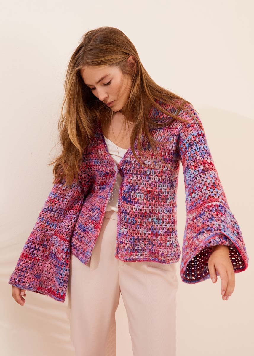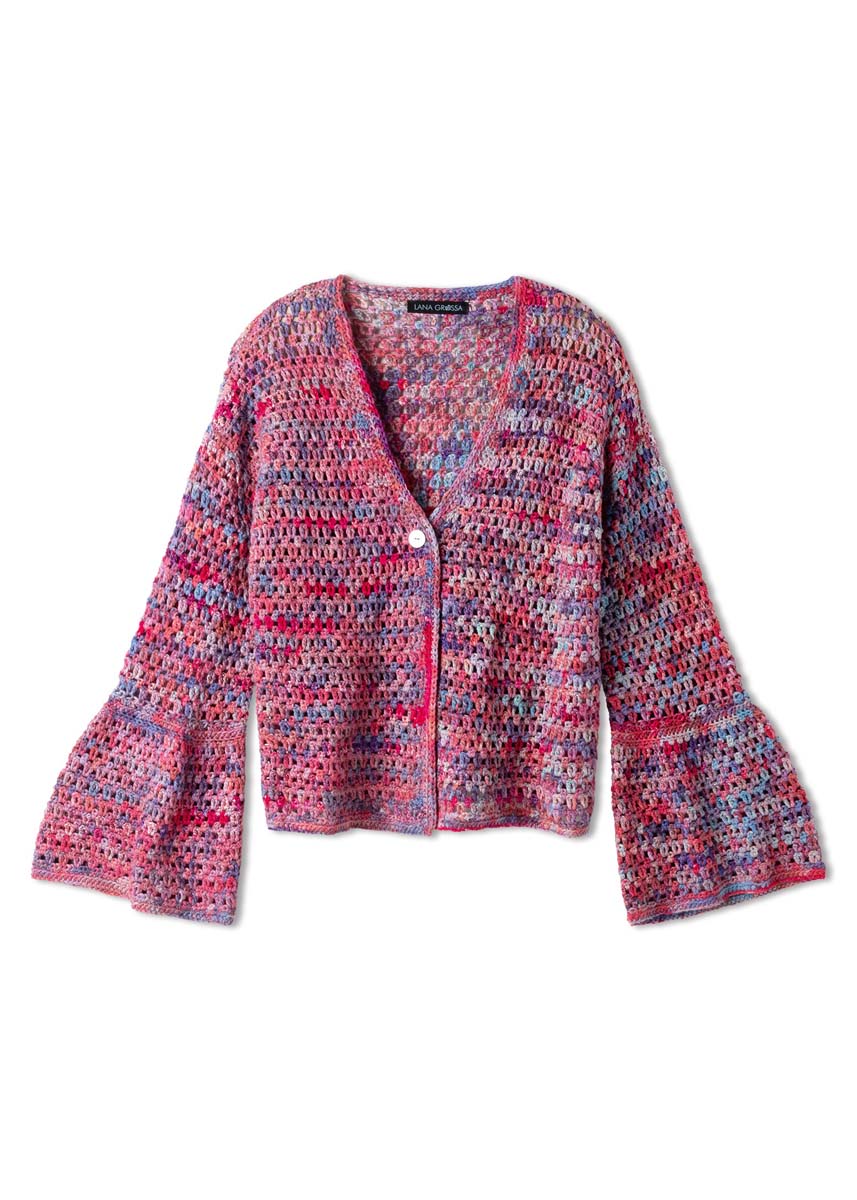 Lana Grossa-Qualität „Cotonella Multi“ (75 % Baumwolle, 25 % Polyacryl, LL = ca 270 m/100 g): ca 500 (600 - 600 - 700) g Hellrot/Lila/Mint/Violett bunt (Fb 102); Häkelnadel Nr 5; 1 farblich passender Knopf, Durchmesser ca 20 mm.