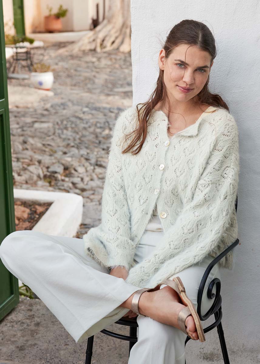 Haariges Garn (neu) taucht hier ein verspieltes Ajour-Muster in ein cooles, diffuses Licht. Dazu passt die moderne Oversize-Form mit überschnittenen Schultern und weiten Ärmeln.