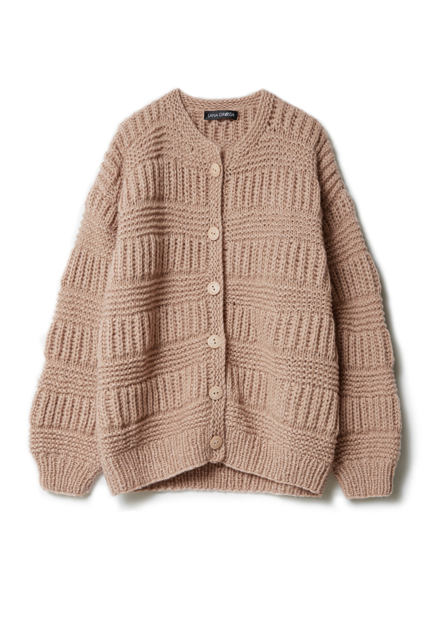 Lana Grossa „Lala Berlin Lovely Cotton“ (75% Schurwolle (Merino superfine), 25% Baumwolle, LL = 90 m/50 g): 550 (600 - 650) g in Beige (Fb. 27); Stricknadeln Nr. 5., Nr. 6,5 und Nr. 8, 1 Rundstricknadel Nr. 7, 50 cm lang, 6 Knöpfe von Union Knopf in Beige, Fb. 16, 25 mm Ø, Art. 454240.