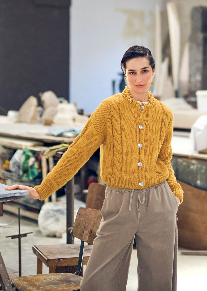 Garn von Lana Grossa, Qualität „Brigitte No. 2“ (47 % Alpaka (Baby), 45 % Baumwolle, 8 % Schurwolle (Merino), Lauflänge 140 m/ 50 g): 500 (500/550/600) g in 18 53 Dottergelb Nr. 71 oder Avocadogrün Nr. 72. Stricknadeln 7 und 8 (wenn Sie locker stricken) oder 8 und 9 (wenn Sie fest stricken) – wichtig ist, dass Sie auf die Angaben in der Maschenprobe kommen. 1 kurze Rundstricknadel 6 (wenn Sie locker stricken) oder 7 (wenn Sie fest stricken). 1 Zopfnadel. 5 Perlmutt- Knöpfe in Farbe Nr. 14, 23 mm Durchmesser, Artikel- Nr. 46286 von Union Knopf.