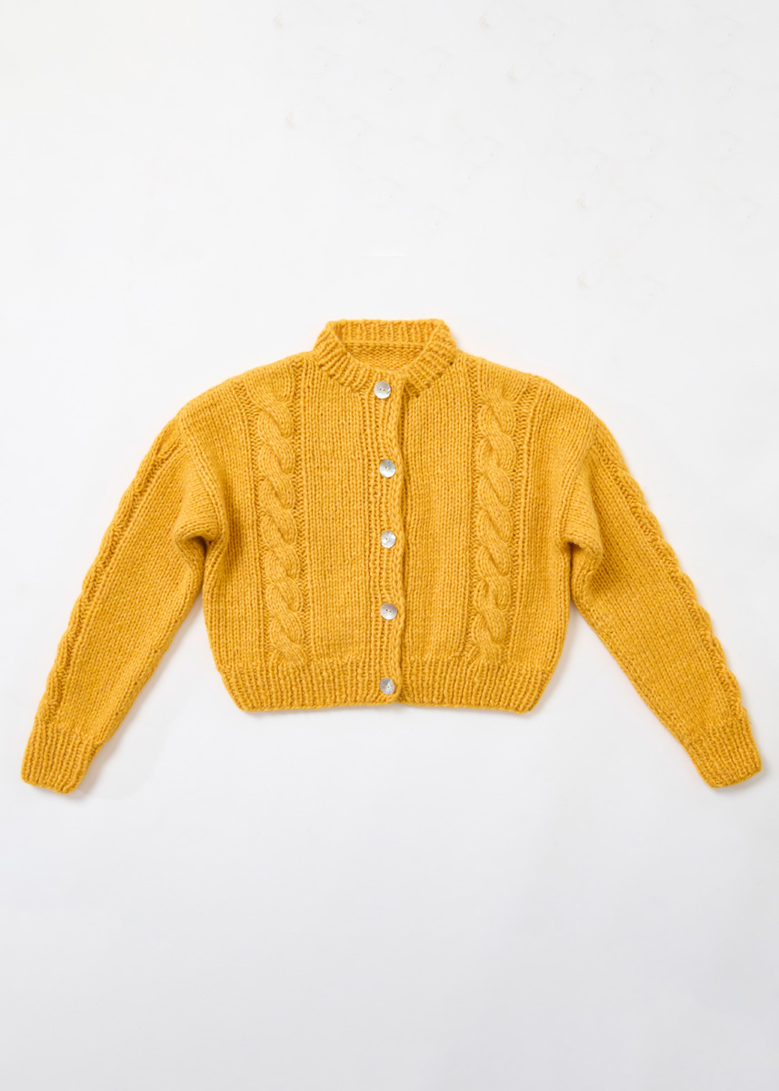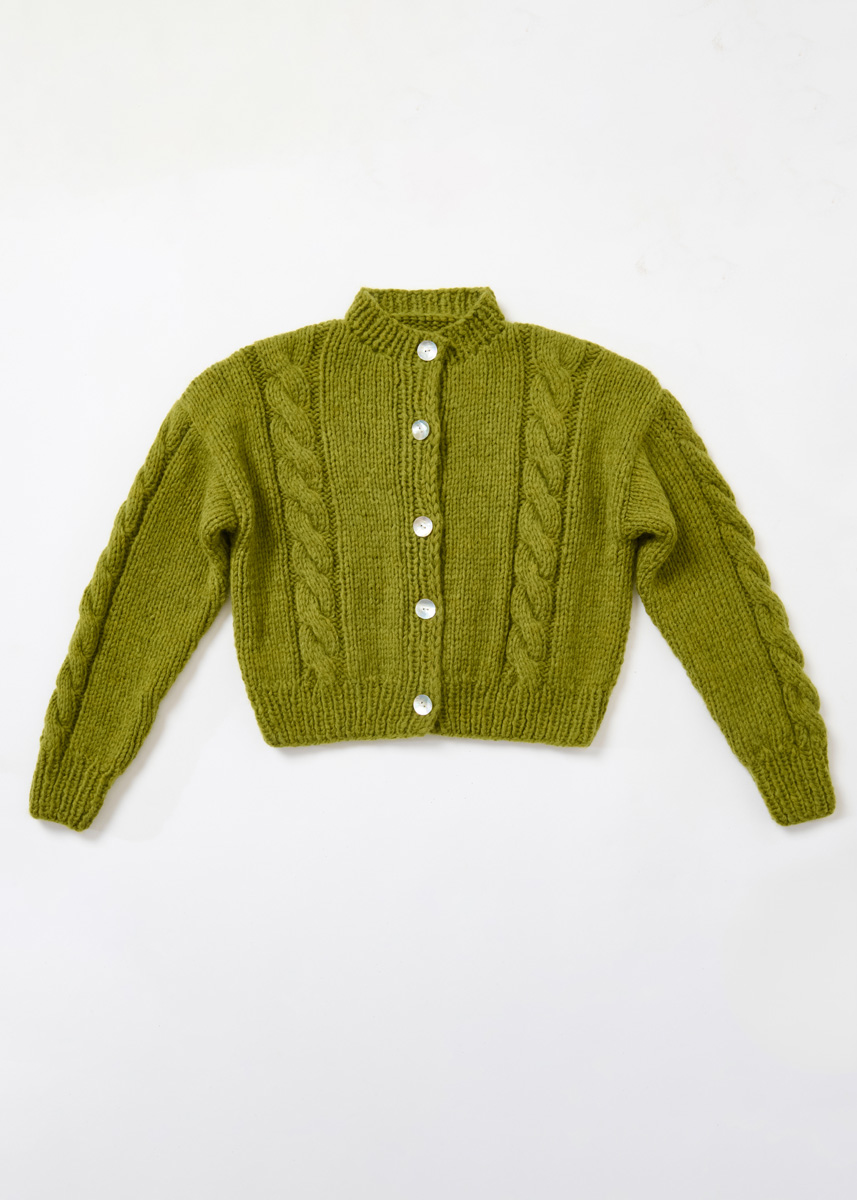 Die Zopfjacke im verkürzten Schnitt passt toll zu weiten Hosen oder Röcken. Bei der Farbe dürfen Sie zwischen Gelb und Grün wählen. Die Jacke mit Zopfmuster wird stets mit doppeltem Faden in einer Farbe gesrickt.