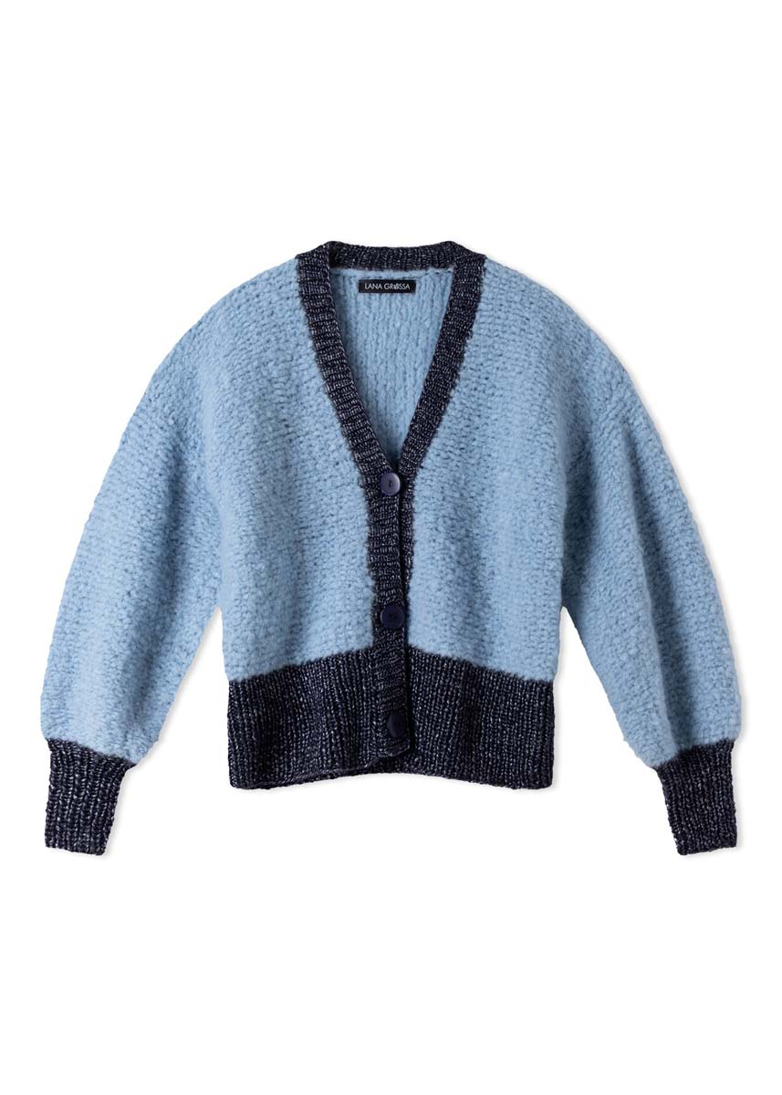 Lana Grossa Royal Alpaca (93% Alpaka (Royal), 7% Polyamid, LL = ca. 95 m/50 g), 200 (250 - 250 - 300) g in Eisblau (Fb 9) und Lana Grossa Lucida (58% Schurwolle (Merino), 42% Viskose, LL = ca. 100 m/50 g), 100 (150 - 150 - 200) g in Anthrazit (Fb 6); Stricknd Nr. 6 und Nr. 8; eine lange RundstrickndNr. 6 (für die vordere Verschlussblende); 3 Knöpfe,