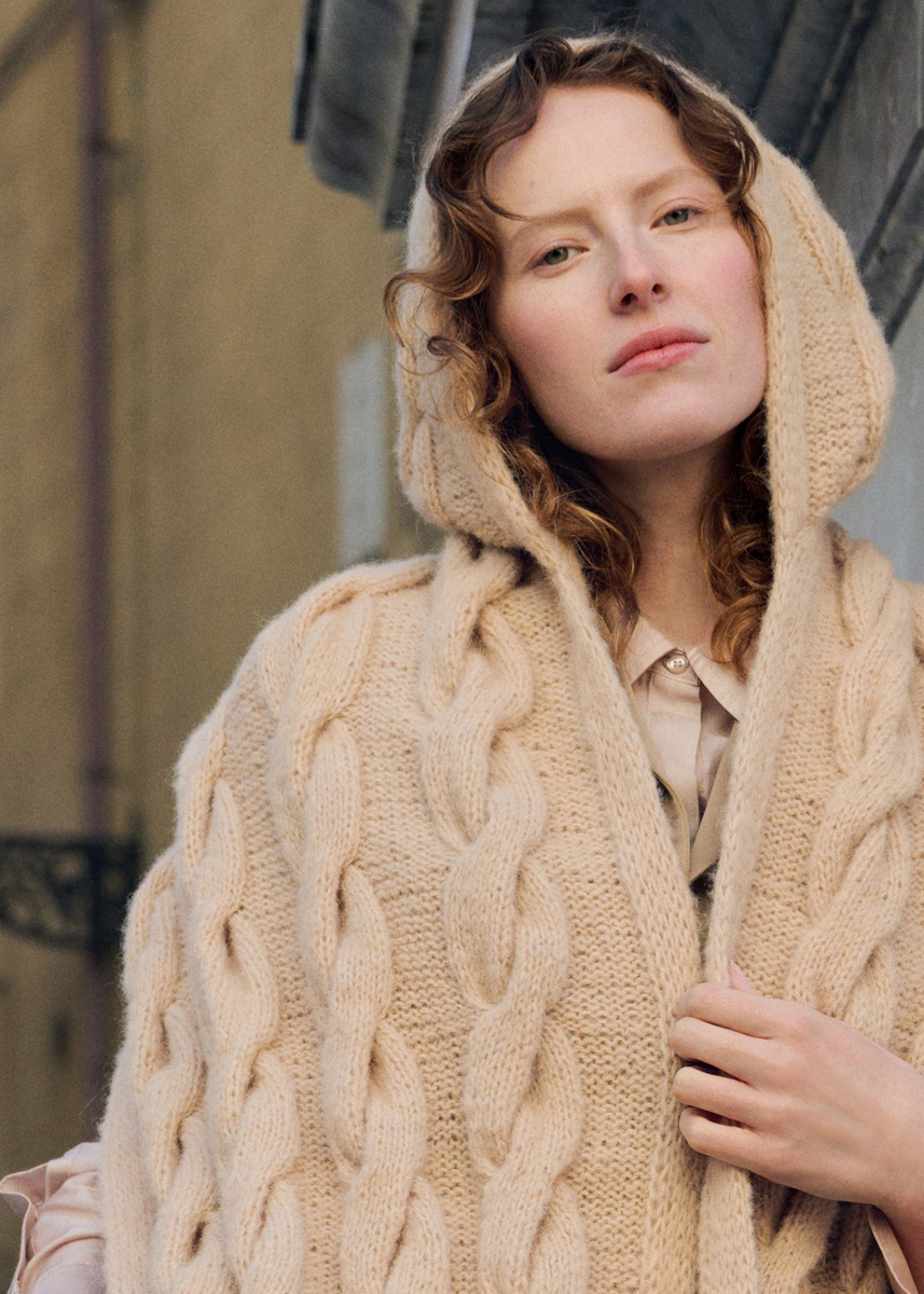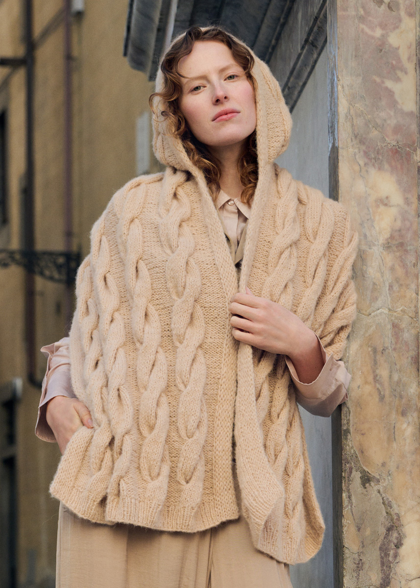Lana Grossa-Qualität „Nebbia“ (55 % Schurwolle (Merino extrafine), 45 % Alpaka (Baby), LL = ca 170 m/50 g): 400 g Beige (Fb 13); Stricknadeln Nr 4 und 6; Zopfnadel; Maschenmarkierer.