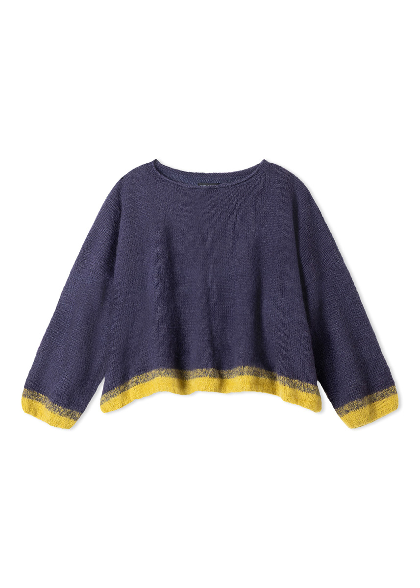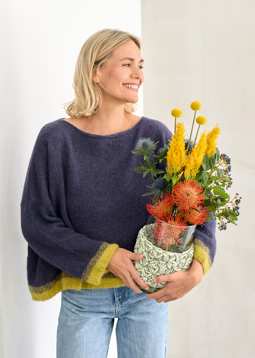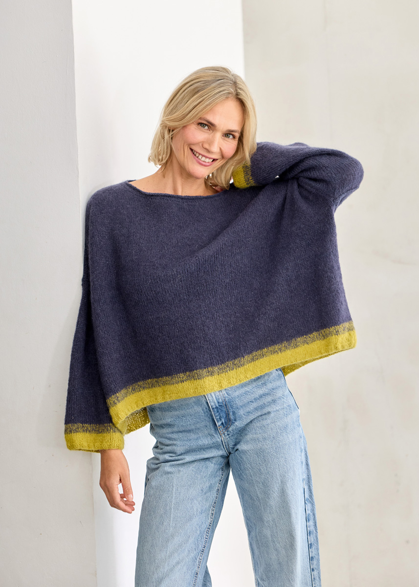 Lana Grossa-Qualität „Setasuri” (69 % Alpaka (Suri), 31 % home 59 MODELL 14 Seide, LL = ca. 212 m/25 g): ca. 250 (275 – 300) g Violettblau (Fb. 74) und ca. 50 (75 – 75) g Senfgelb (Fb. 78); Stricknadeln Nr. 4,5, 1 Rundstricknadel Nr. 4,5, 60 cm lang.