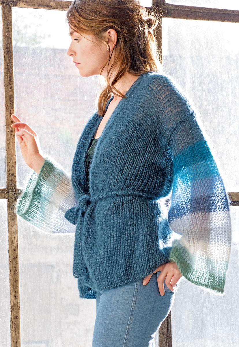 Lana Grossa-Qualität „Silkhair“ (70 % Mohair Superkid, 30 % Seide, LL = ca. 210 m/25 g), 150 (150) 175 g Dunkelpetrol (Fb 66), 25 g Petrol (Fb 23), 25 g Türkisblau (Fb 68), 25 g Kornblume (Fb 40), 25 g Dunkelblau (Fb 79), 25 g Himmelblau (Fb 92), 25 g Hellblau (Fb 42), 25 g Silbergrau (Fb 41), 25 g Helltürkis (Fb 82) und 25 g Dunkelgrün (Fb 89). Strick-Nd Nr 8 und Nr 10; 2 Hilfs-Nd (zum M stilllegen).