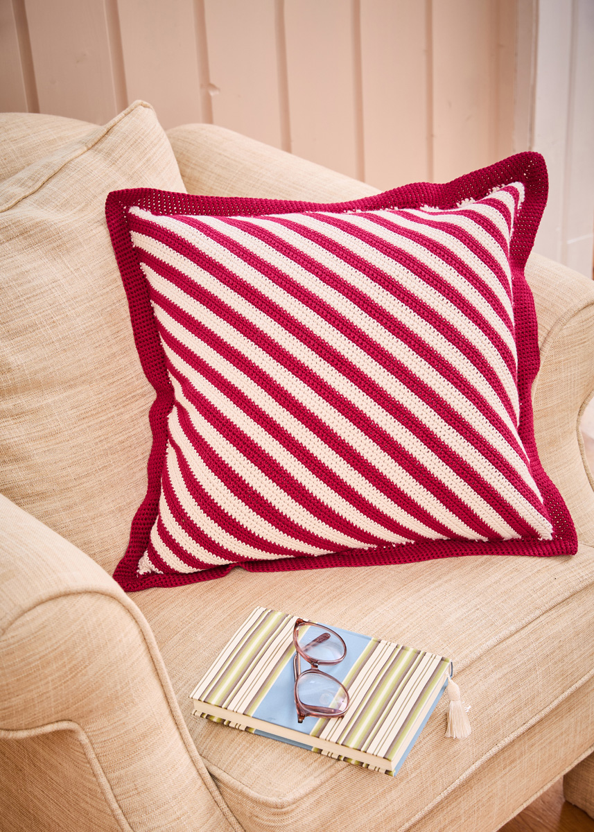 Lana Grossa-Qualität „Landlust- Baumwolle“ (100 % Baumwolle (Bio), LL ca. 115 m/50 g), 250 g in Weinrot (Fb 23) und 200 g in Natur (Fb 3); 1 Häkelnadel Nr. 3,5, 1 Kissenfüllung 50 x 50 cm.