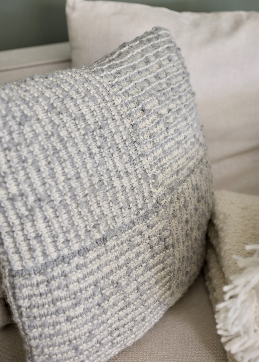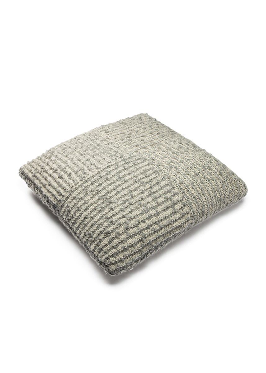 Lana Grossa-Qualität „Caramella” (53 % Schurwolle (Merino), 25 % (Baby) Alpaka, 22 % Polyamid, LL = ca. 110 m/50 g): ca. 150 g Hellgrau (Fb. 12) und Lana Grossa- Qualität „Brigitte No. 2” (47 % (Baby) Alpaka, 45 % Baumwolle, 8 % Schurwolle (Merino), LL = ca. 140 m/50 g): ca. 100 g Rohweiß (Fb. 16); Stricknadeln Nr. 4; 1 waschbare Kissenfüllung, 50 x 50 cm.
