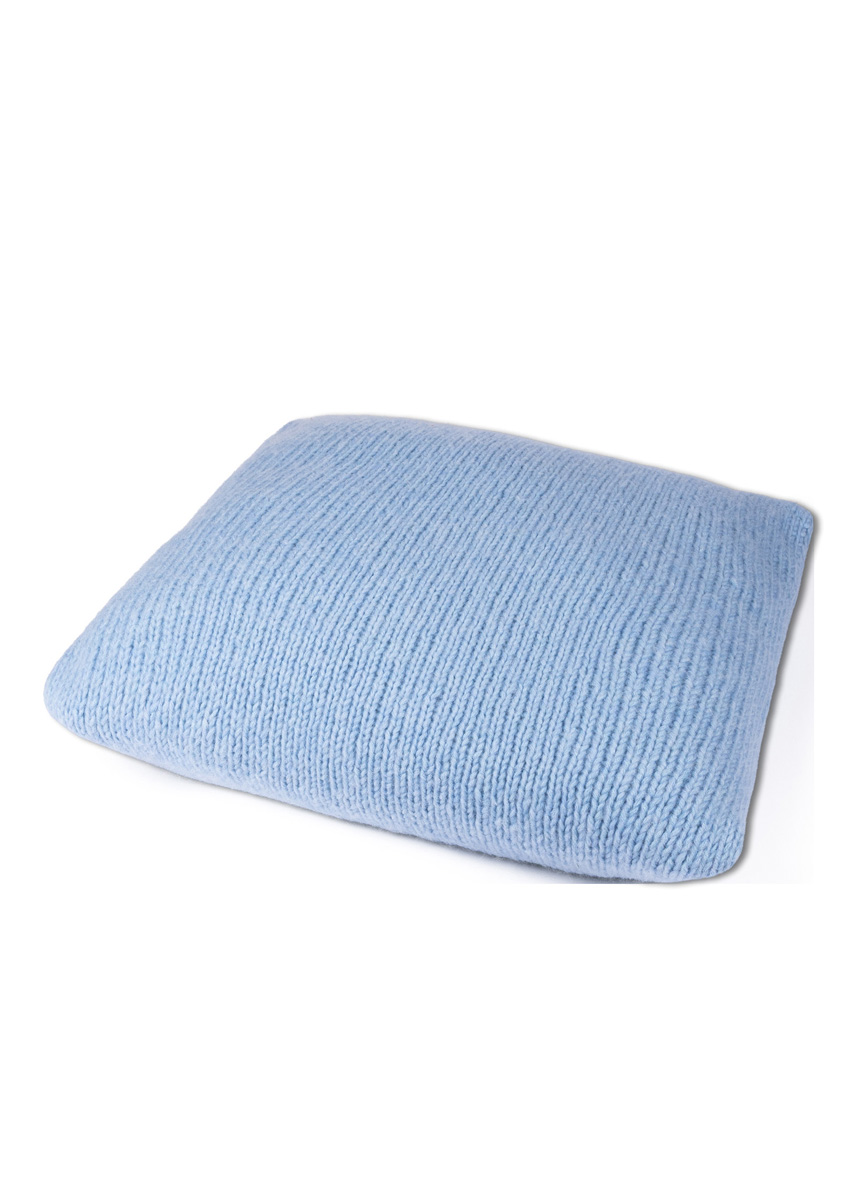 Lana Grossa-Qualität „Ecopuno Chunky” (48 % Baumwolle, 33 % Schurwolle (Merino extrafine), 19 % (Baby) Alpaka, LL = ca. 70 m/50 g): ca. 350 g Pastellblau (Fb. 142); Stricknadeln Nr. 7 und 7,5; 1 waschbare Kissenfüllung, 50 x 50 cm.