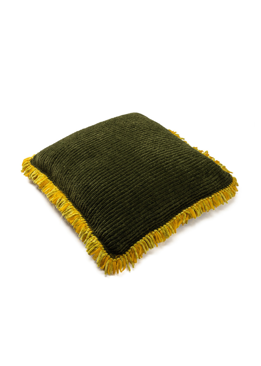 Lana Grossa-Qualität „The Look” (100 % Polyester, LL = ca. 120 m/100 g): ca. 300 g Dunkeloliv (Fb. 19) und ca. 100 g Limette (Fb. 16) und Lana Grossa-Qualität „Basta” (50 % Schurwolle (Merino), 50 % Polyamid, LL = ca. 100 m/50 g): ca. 50 g Senfgelb (Fb. 12); Stricknadeln Nr. 5, 1 Wollhäkelnadel Nr. 5; 1 waschbare Kissenfüllung, 50 x 50 cm.