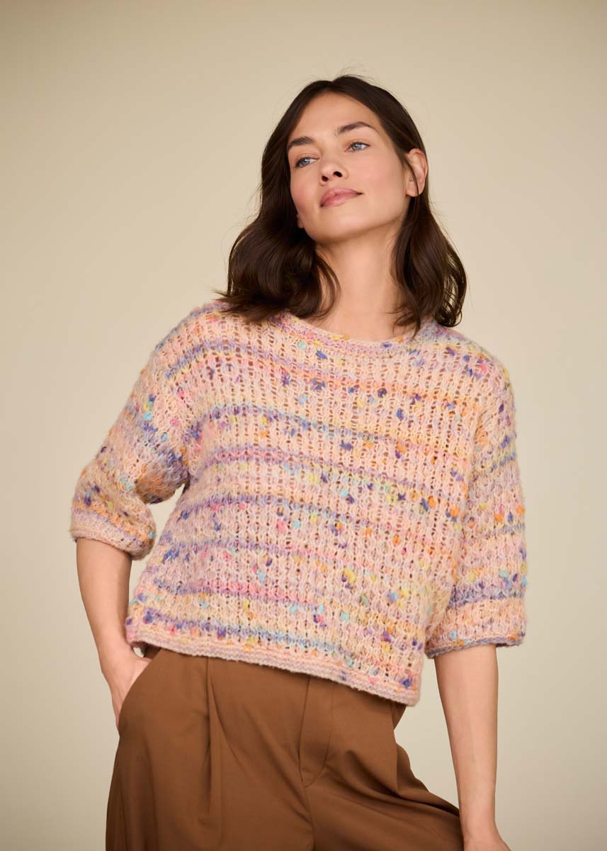 Lana Grossa-Qualität „Cassata“ (54 % Schurwolle (Merino extrafine), 30 % Polyamid, 16 % Baumwolle, LL = ca 175 m/50 g): 150 (200 - 200 - 250) g Pfirsich/Blau/Gelb/Orange/Flieder (Fb 1); Stricknadeln Nr 4,5 und 6; 1 kurze Rundstricknadel Nr 4,5.