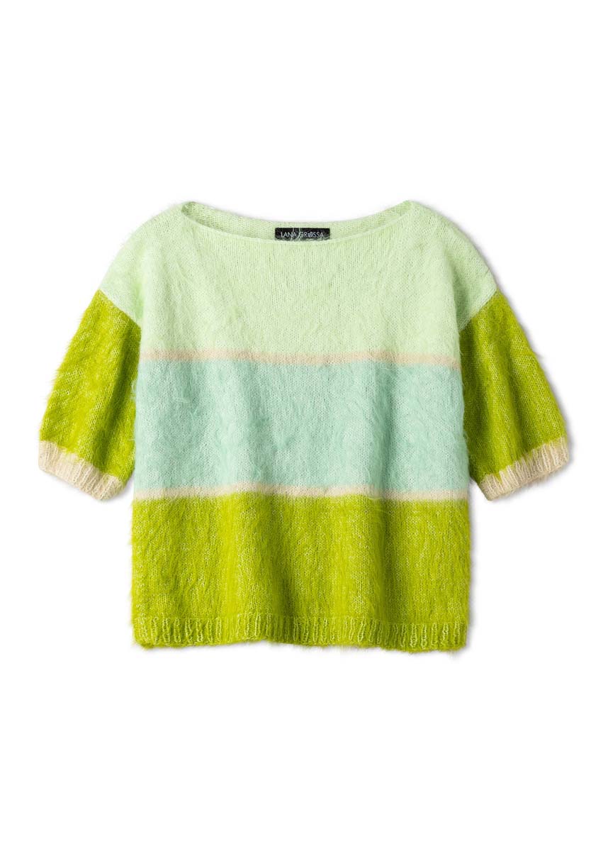 Das Anfängermodell von Seite 14, hier mit schlankerer Passform und verkürzten Ärmeln. Dazu gesellen sich kühle Pastelltöne – sinnlich inszeniert, dank Flauschgarn Finito (neu).