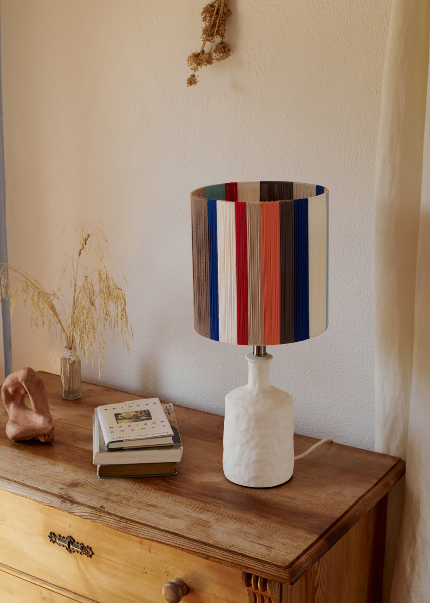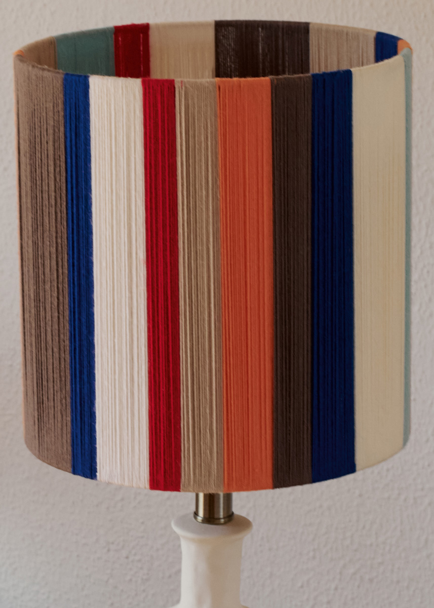 Für das stylische Licht-Objekt wird ein Lampenschirm mit bunten Garnen umwickelt. Damit die Fäden an ihrem Platz bleiben, haben wir Ober- und Unterrand des Schirms mit doppelseitigem Klebeband eingefasst. Die Wickel-Prozedur erfordert Geduld – aber die Mühe lohnt sich.