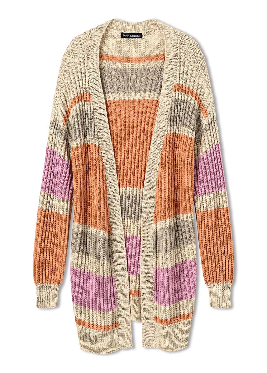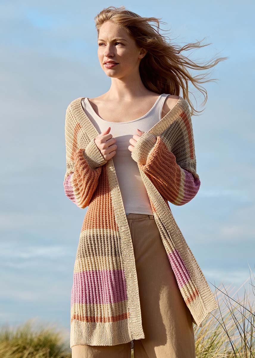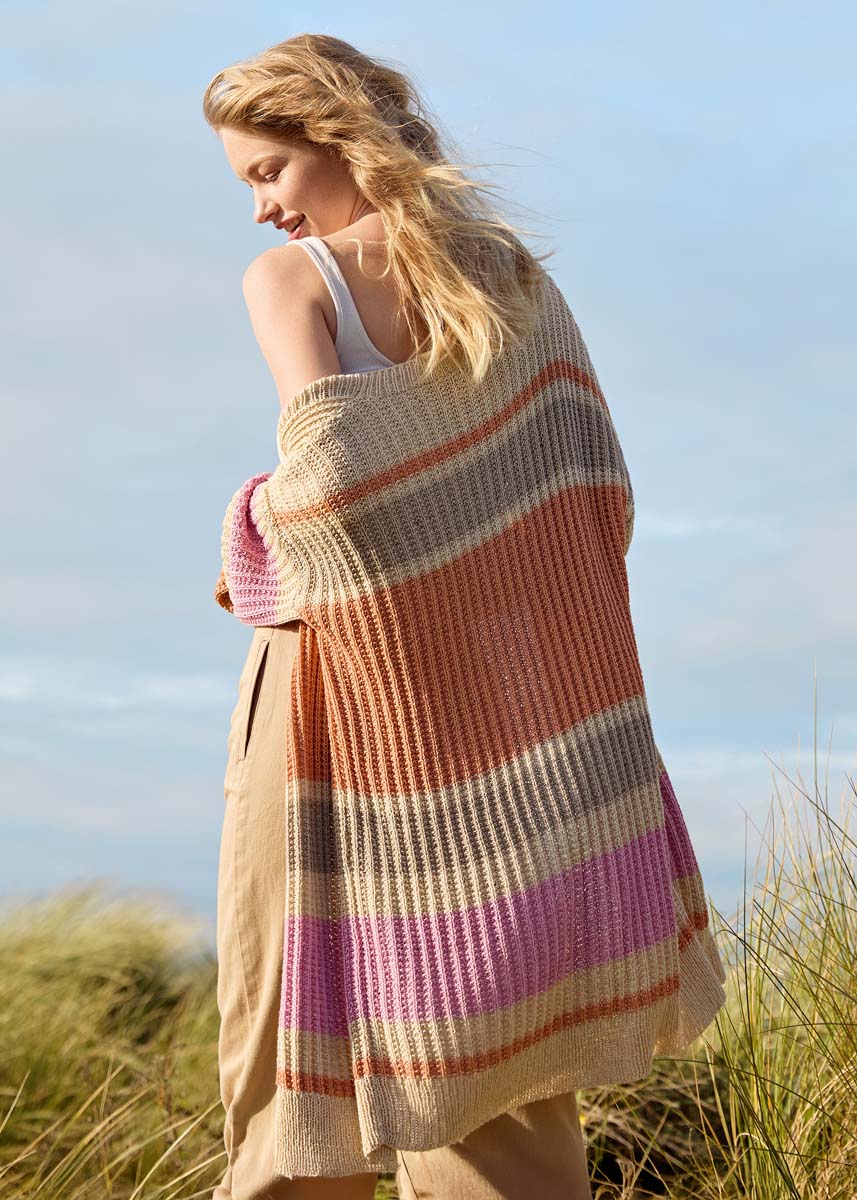 Lana Grossa-Qualität „Solo Lino” (80 % rec. Leinen (Viskose), 20 % Leinen, LL = ca. 120 m/50 g): ca. 400 (450 – 450) g Perlweiß (Fb. 56), ca. 300 (300 – 350) g Lachs (Fb. 63), ca. 150 g Rosa (Fb. 66) und ca. 100 g Beige (Fb. 21); Stricknadeln Nr. 3 und 3,5, 1 Rundstricknadel Nr. 3, 120 cm lang.
