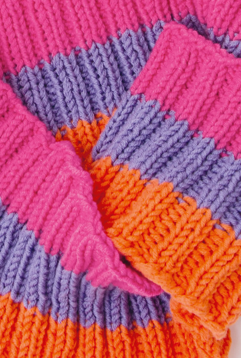 Lana Grossa Qualität „Elastico Big“, 96 % Baumwolle, 4 % Polyester, Lauflänge 105 m/50 g; je 50 g Mandarin (Fb 14), Lila (Fb 36) und Pink (Fb 15); eine 60 cm lange Rundstricknadel Nr. 4,5.