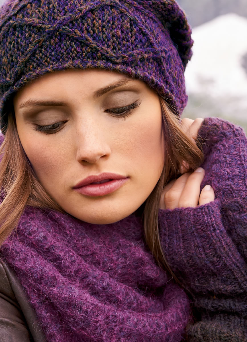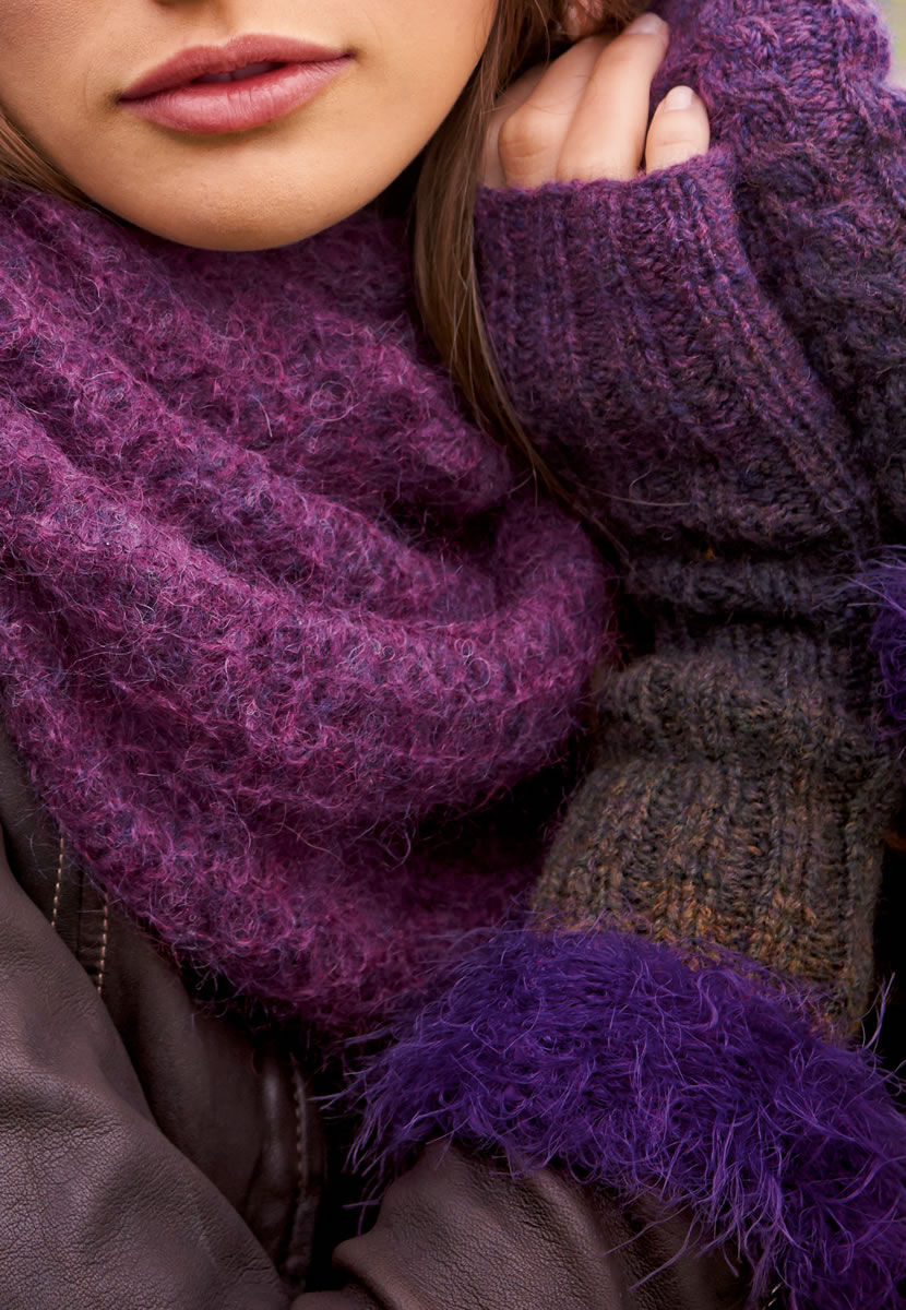Lana Grossa-Qualität „Garzato Fleece“ (70 % (Baby) Alpaka, 30 % Polyamid, LL ca. 225 m/50 g): ca. 50 g Lila/Schwarz (Fb. 7) und Lana Grossa-Qualität „Silkhair Melange“ (70 % Mohair (Superkid), 30 % Seide, LL ca. 210 m/25 g): ca. 25 g Rotviolett meliert (Fb. 710); 1 Rundstricknadel Nr. 7, 100 cm lang.