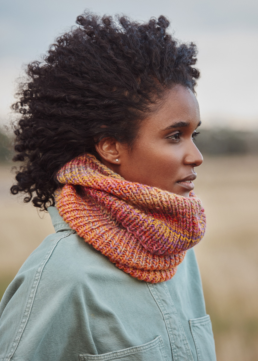 Lana Grossa-Qualität „Gomitolo Pablo“ (60 % Schurwolle, 40 % Polyacryl, LL = ca 700 m/200 g): 1 Knäuel = ca 200 g Mais-/Goldgelb/Petrol/Orange/Rosa/Pink/Violett (Fb 3016); 1 kurze Rundstricknadel oder Nadelspiel Nr 5,5.
