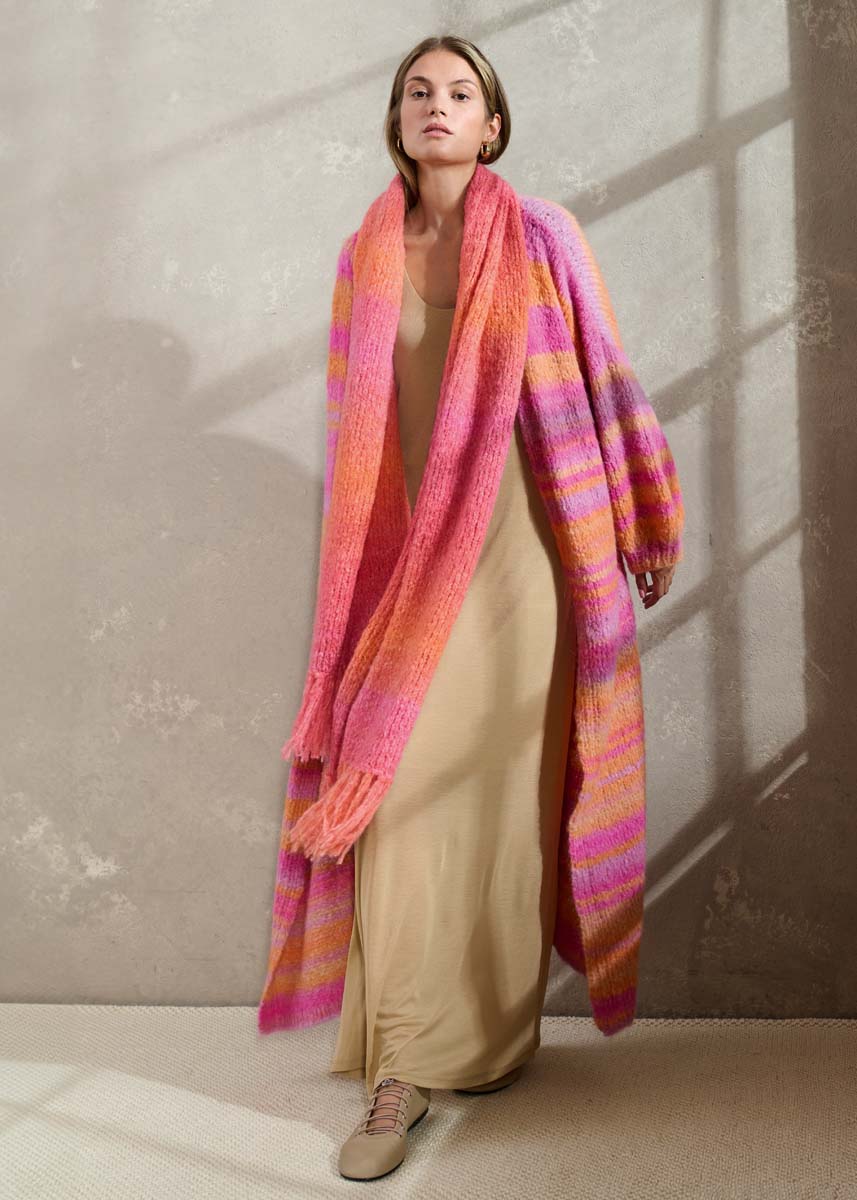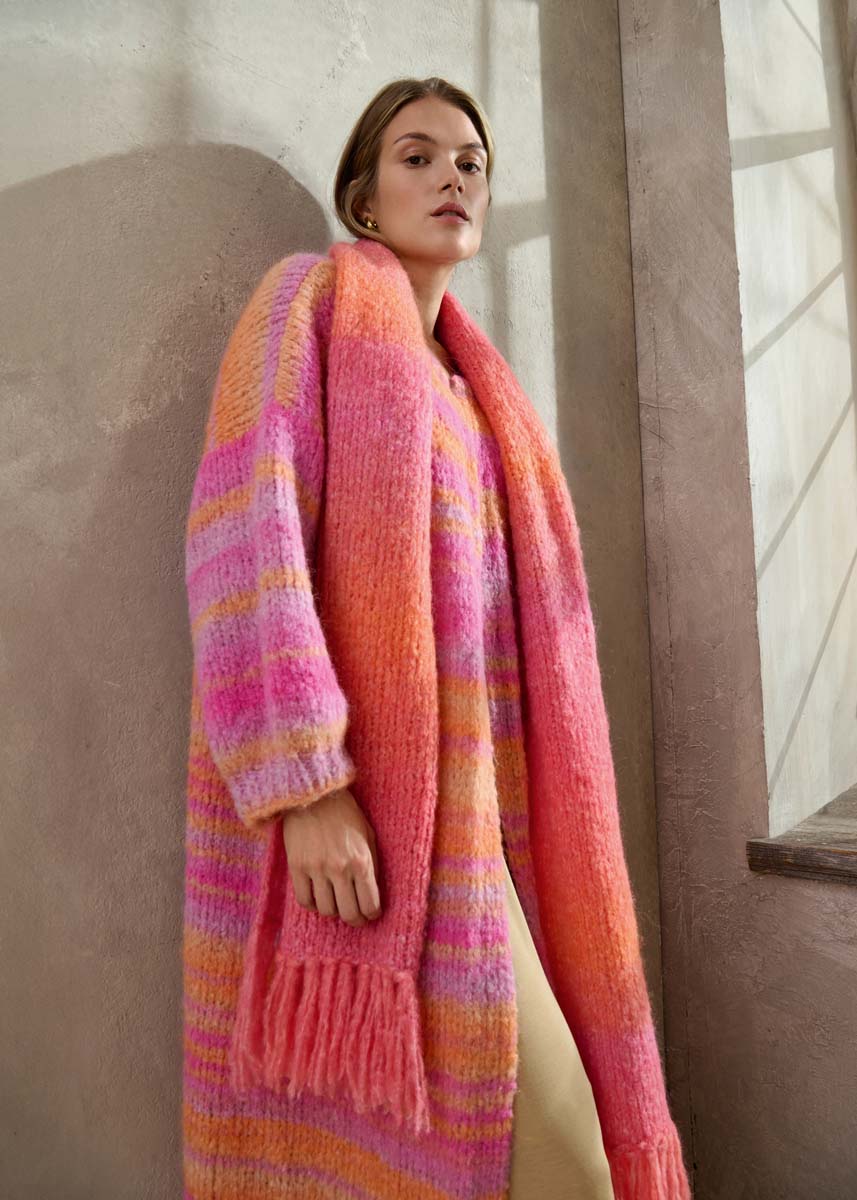 Lana Grossa „Gigante“ (70% Alpaka (Fein), 30% Polyamid, LL = ca. 300 m/100 g): ca. 400 (500 – 500) g Orange/Pink/Safrangelb/Lila/Veilchenblau (Fb.1); je eine Rundstricknadel Nr. 6 und Nr. 7, Länge 100 cm; eine Rundstricknadel Nr. 6, Länge 40 cm