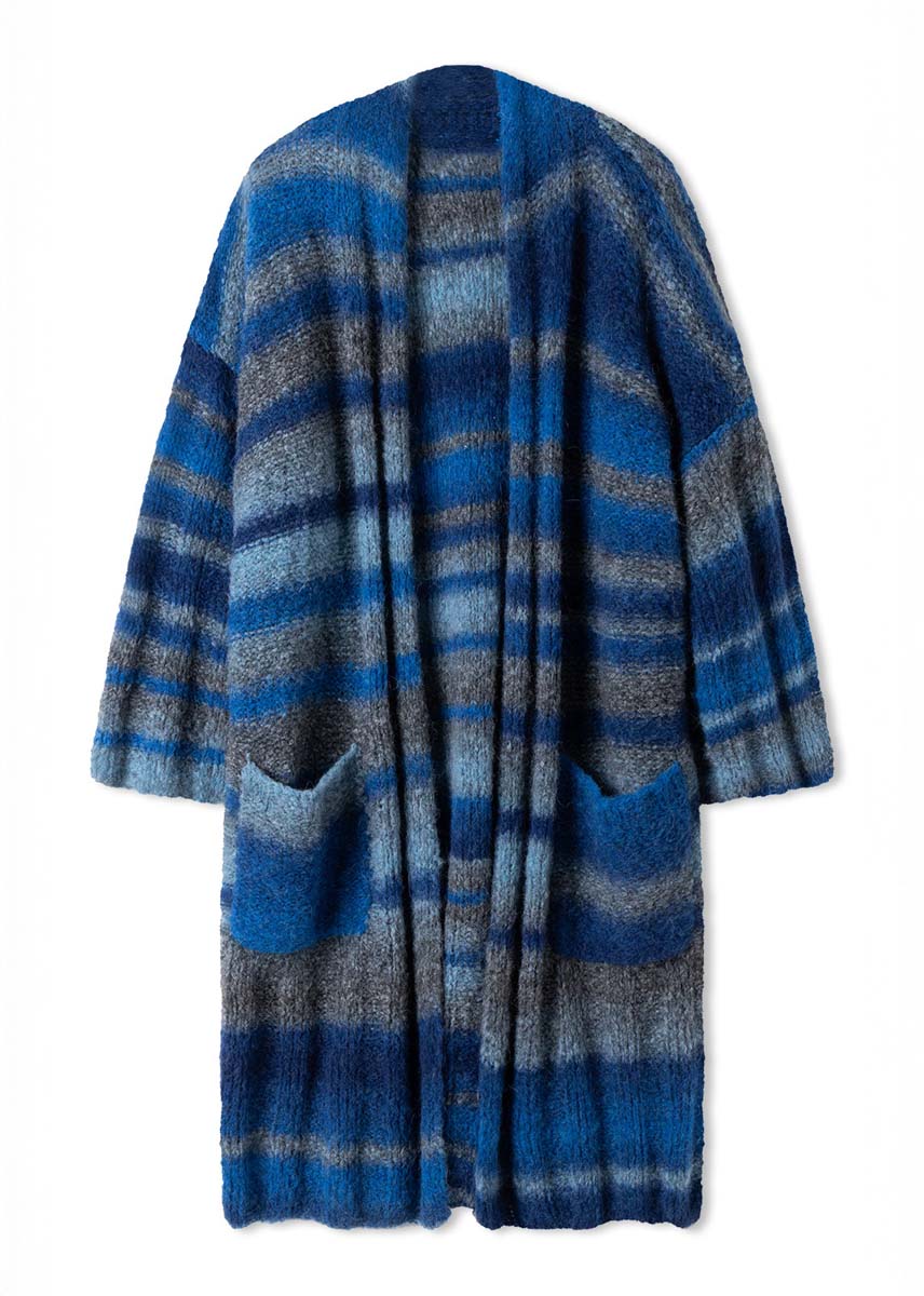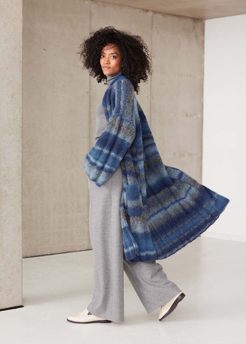 Easy, aber eindrucksvoll – der MANTEL aus Flauschgarn mit Farbverlauf. Der untere Teil wird in Rippen gestrickt, der obere glatt rechts. Dazu gibt es einen Schalkragen und praktische Taschen.