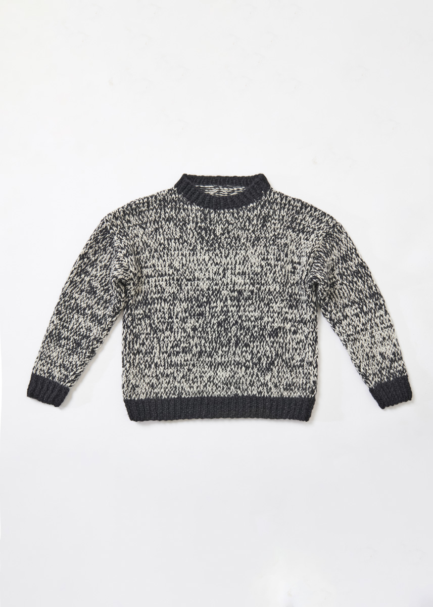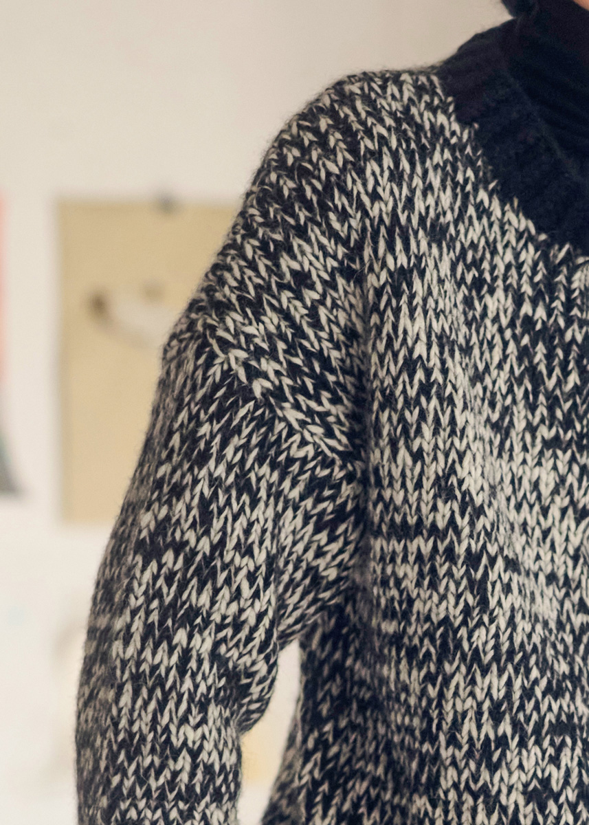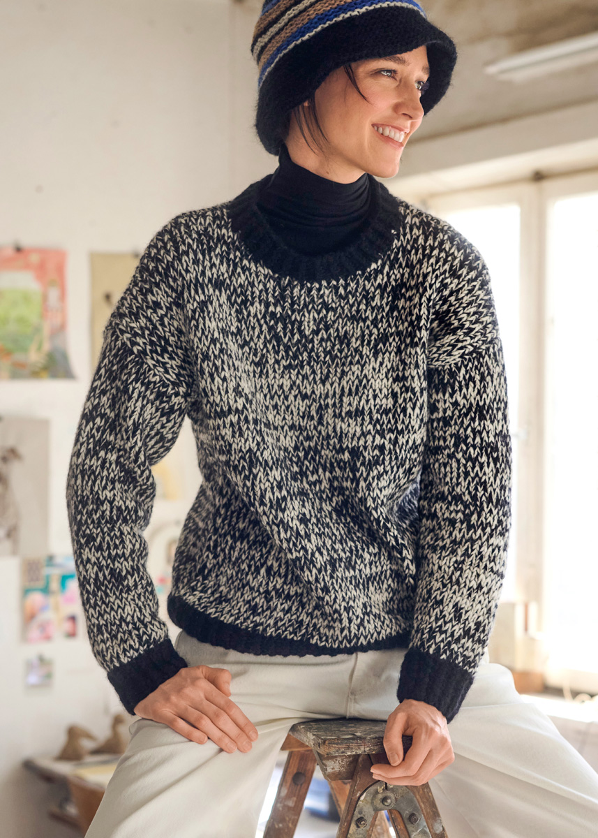 Im doppelten Faden gestrickt, mischen sich Schwarz und Weiß wie zufällig. Einfarbige Bündchen bilden einen ruhigen Rahmen.