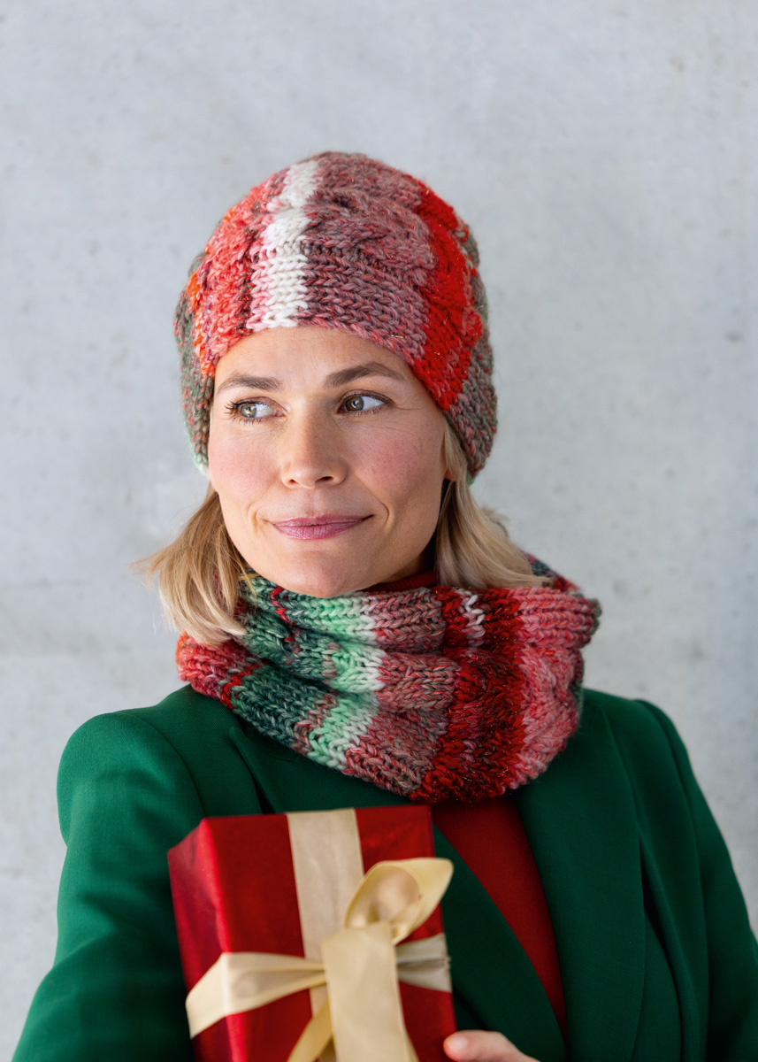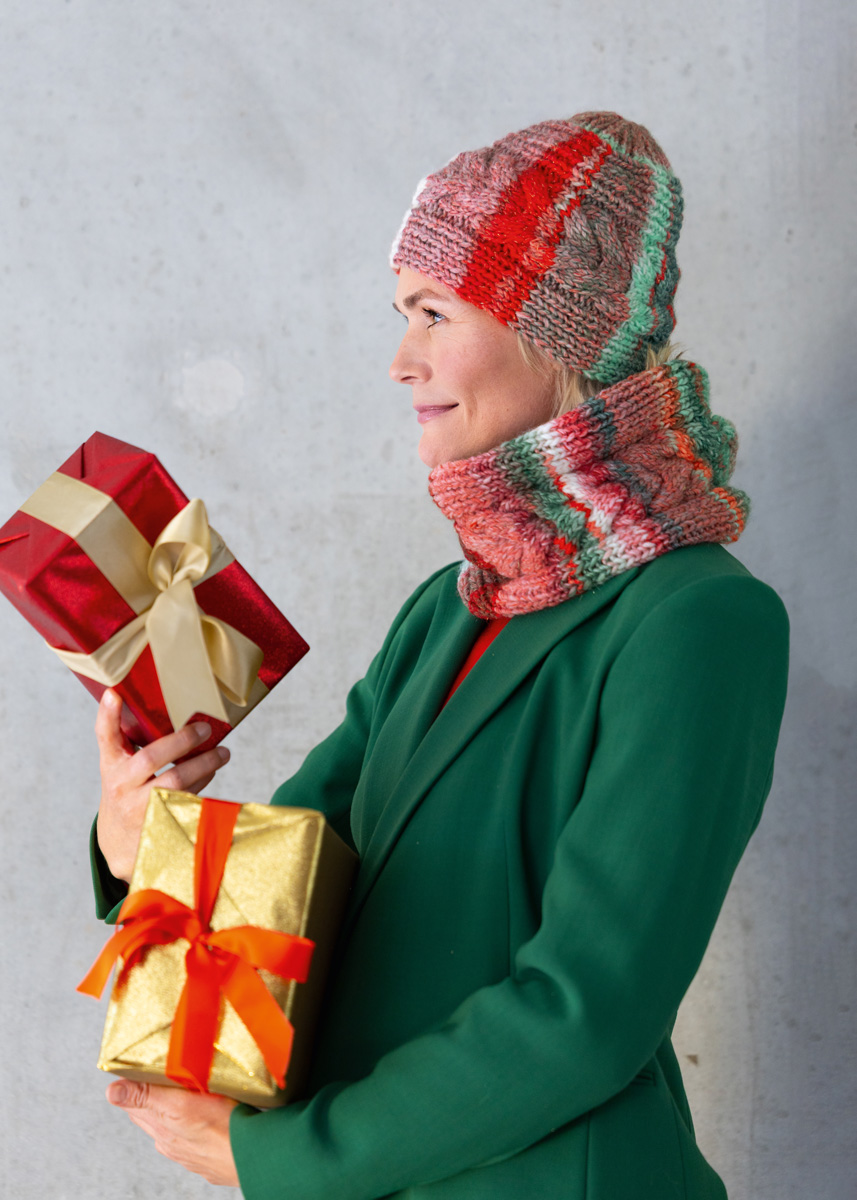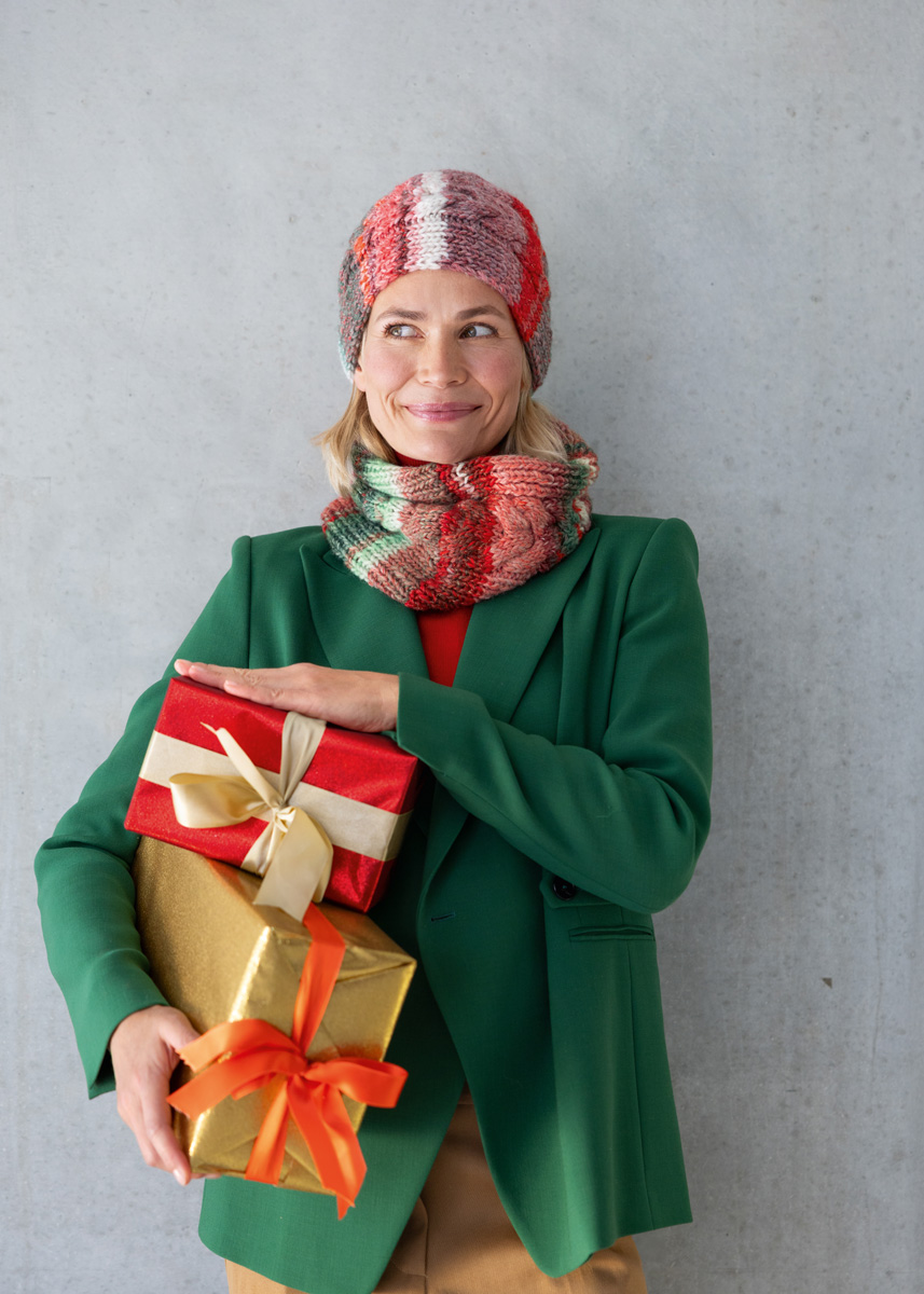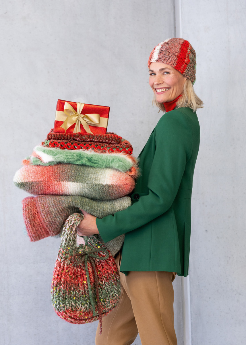 Lana Grossa-Qualität Christmas Edition Big Lurex (60% Schurwolle, 40% Polyacryl, LL = ca 180 m/100 g): 100 g Graurot/Rot/Ecru/Schwarz-/Weißrot/Orange/Dunkel-/Weißgrün/Dunkelgrau/-rot verschieden gestreift (Fb 203); Stricknadeln Nr 6; 1 Nadelspiel Nr 6; 1 Zopfnadel.