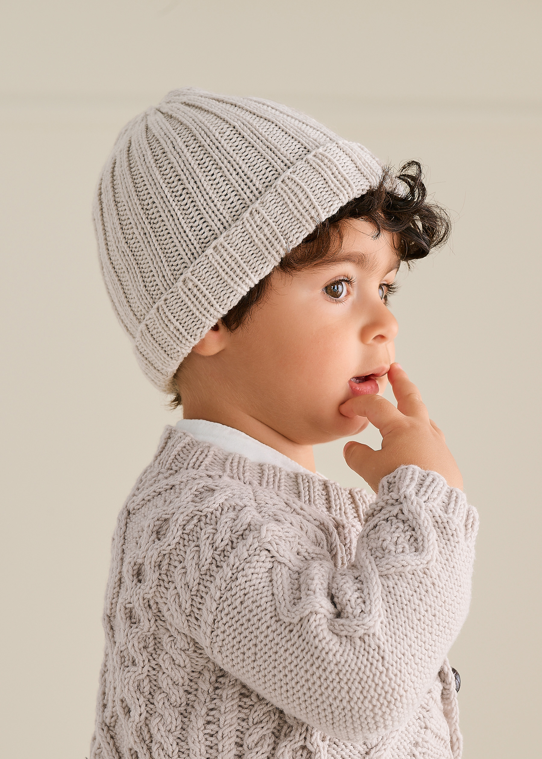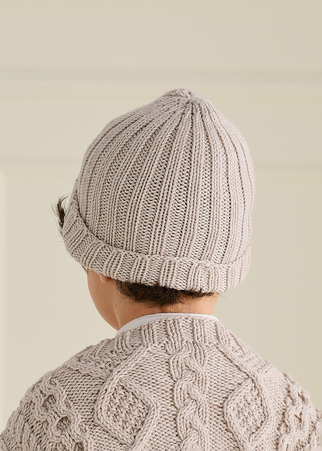 Lana Grossa Cool Wool Big (100% Schurwolle (Merino extrafine); LL = 120 m/50 g): 50 (50/100/100/150) g Grège (Fb. 1010); ein Nadelspiel 4 mm (alternativ mit einer Rundstricknadel in der Magic-Loop-Methode arb); Maschenmarkierer.