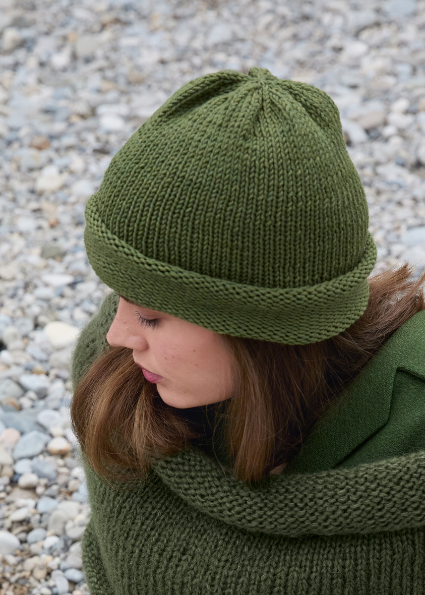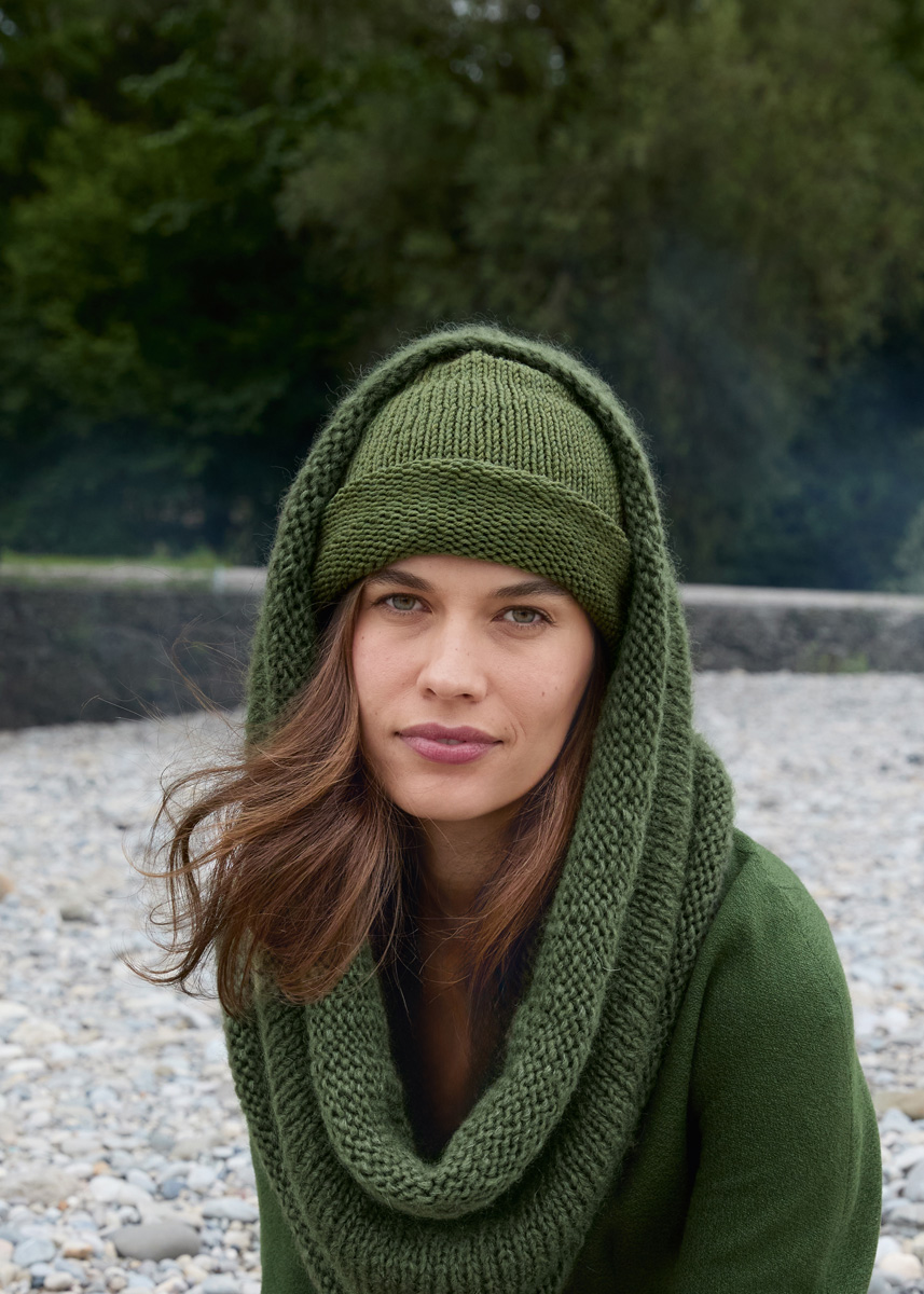 Lana Grossa „Cool Wool Superbig Mélange“ (100% Schurwolle (Merino extrafine), LL = 80 m/50 g): 100 g Oliv meliert (Fb 212); Nadelspiel Nr 5,5.