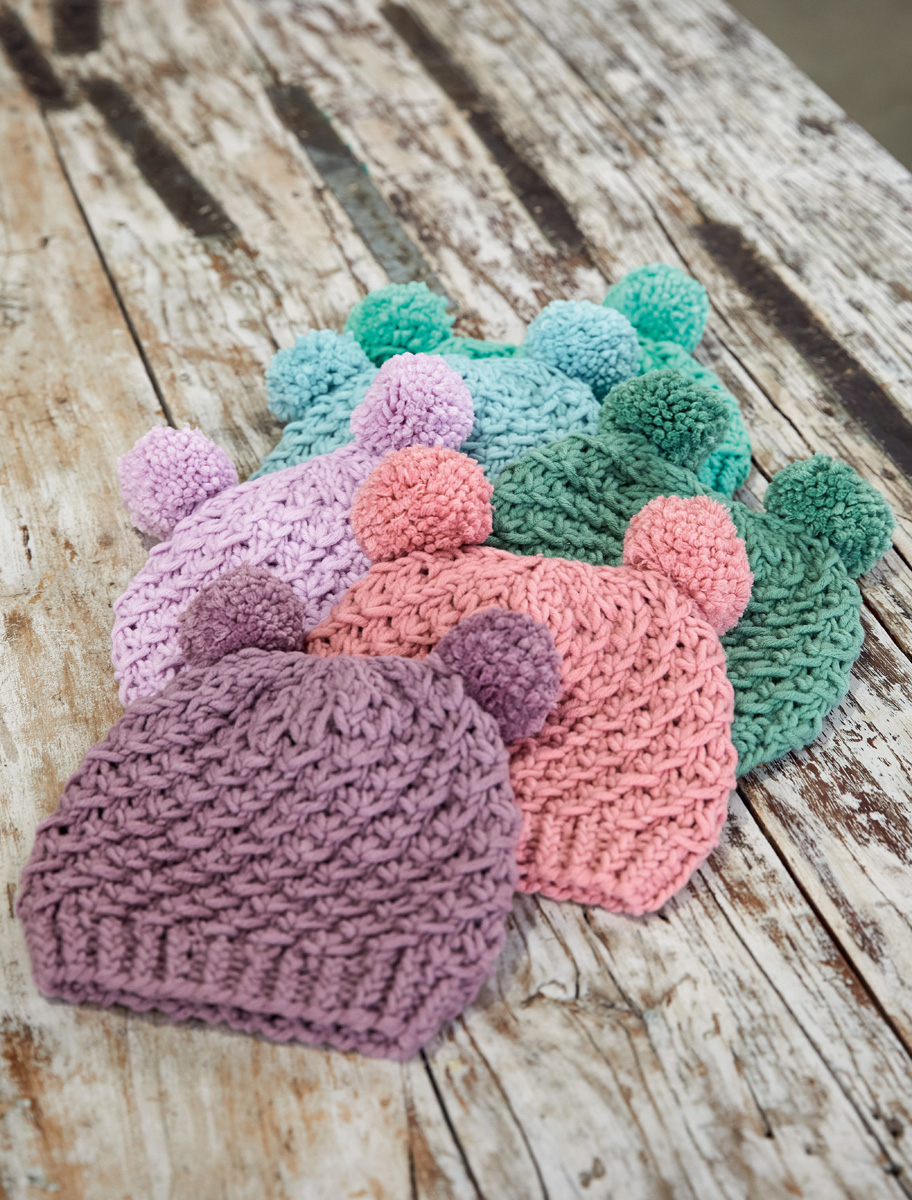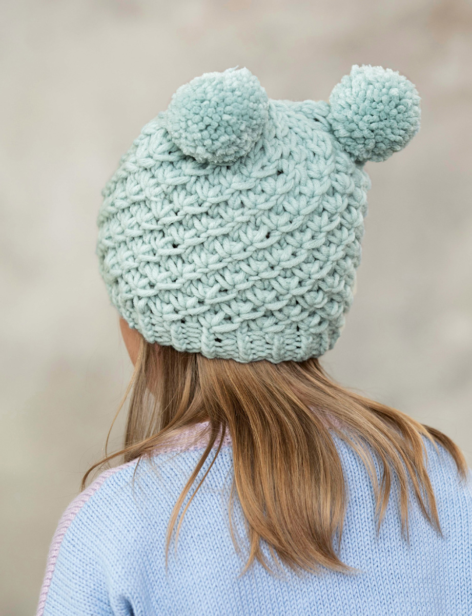 Lana Grossa Mille II (50 % Schurwolle Merino extrafine, 50 % Acryl, Lauflänge 55 m/50 g), 100 (150) g Mint (Fb 86), bzw. helles Jadegrün (Fb 115), bzw. Graugrün (Fb 116), bzw. Altrosa (Fb 121), bzw. Zartlila (Fb 59), bzw. Antikviolett (Fb 66); 1 Spiel Stricknadeln Nr. 7 und 8, 1 Pomponset von LANA GROSSA, Ø 6,5 cm.