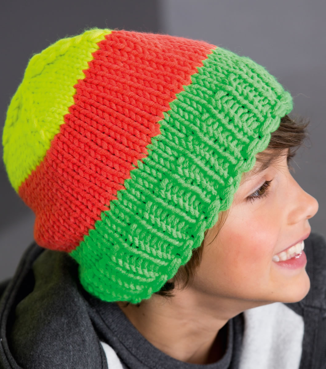 Lana Grossa Qualität „Mille II Neon” (50% Schurwolle, 50% Polyacryl, LL = 55 m/50 g), je ca. 50 g Neongrün (Fb 504), Neonorange (Fb 503) und Neongelb (Fb 501), 1 Spielstricknadeln Nr. 7