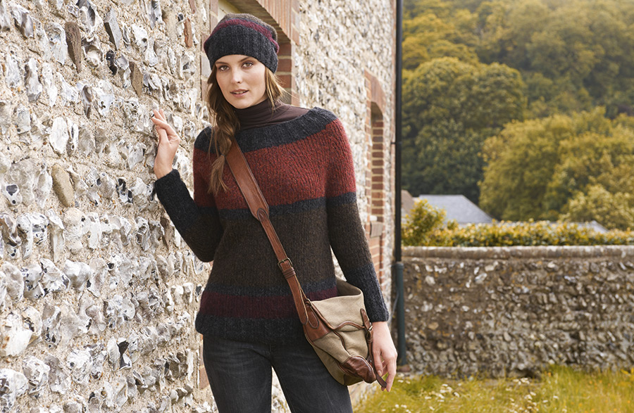 Lana Grossa-Qualität „Garzato Fleece” (70 % (Baby) Alpaka, 30 % Polyamid, LL = ca. 225 m/50 g): je ca. 50 g Schwarz/Anthrazit (Fb. 9), Weinrot/Schwarz (Fb. 8), Mokka meliert/ Schwarz (Fb. 4) und Rost/Schwarz (Fb. 5); Spielstricknadeln Nr. 4 und 5.