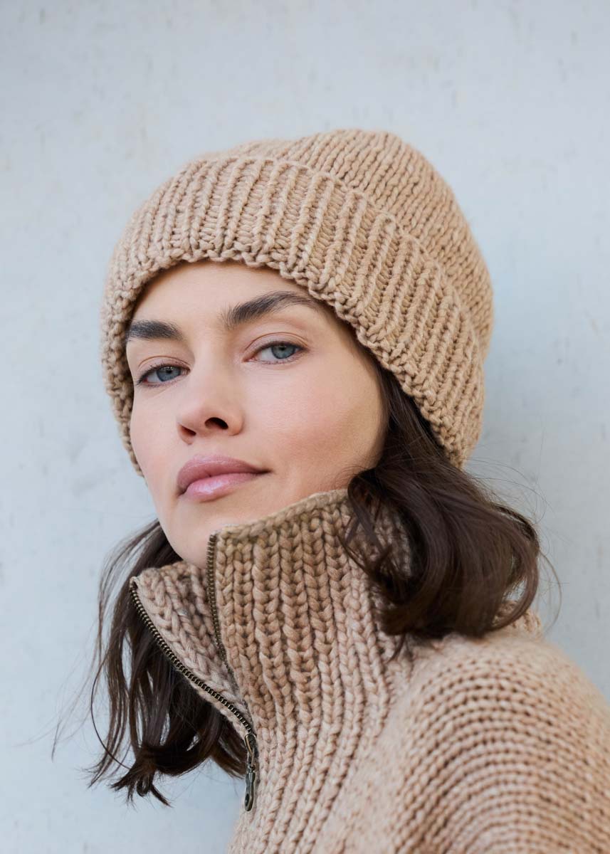 Lana Grossa-Qualität „Winter Softness“ (62 % Schurwolle (Merino extrafine), 38 % Baumwolle (Bio), LL = ca 70 m/50 g): 100 g Beige (Fb 18); kurze Rundstricknadel und Nr 6 und 7; Nadelspiel Nr 6.