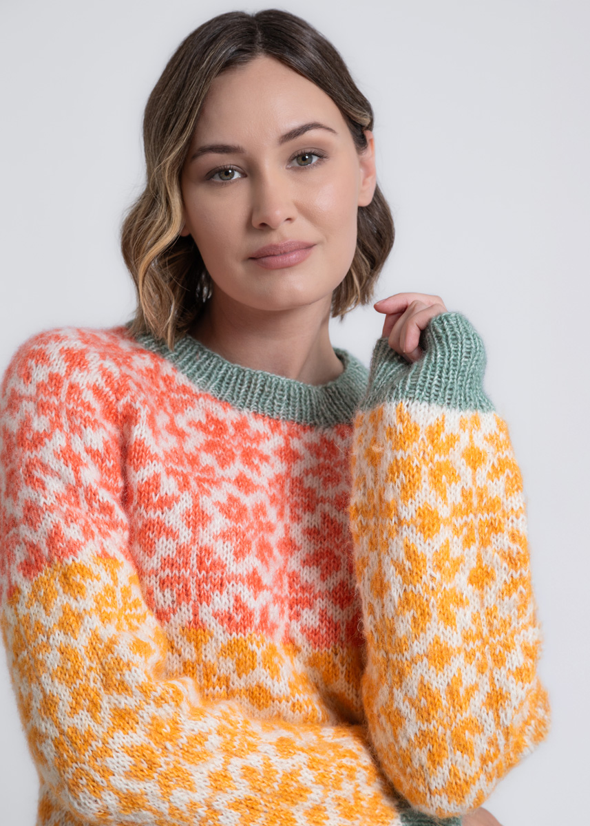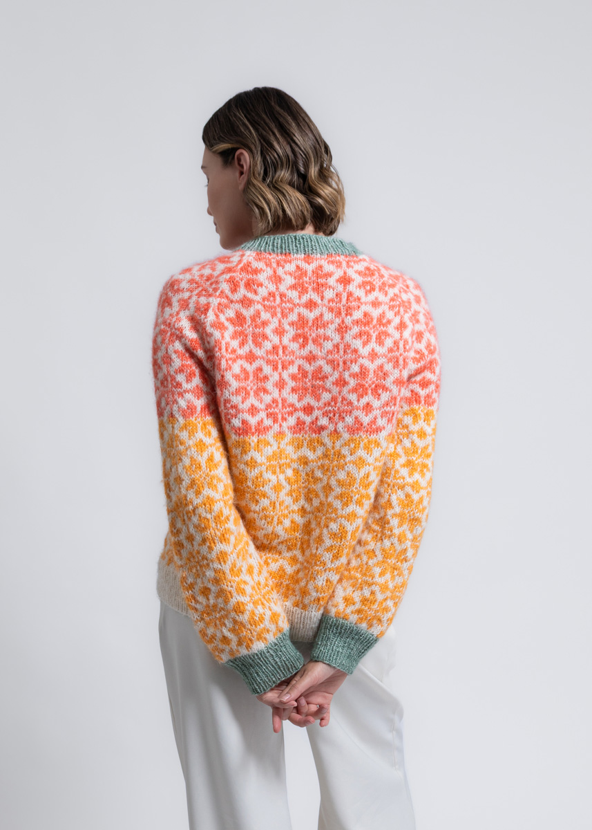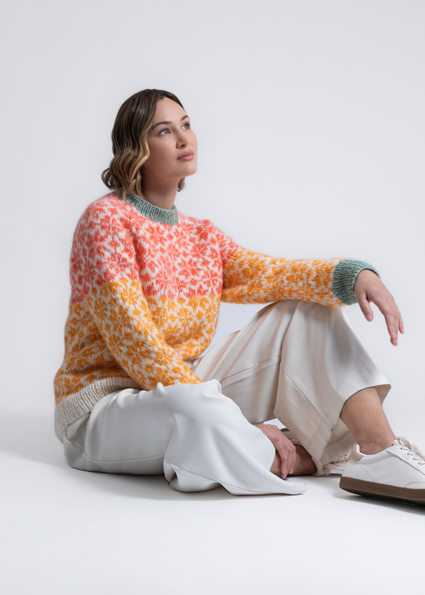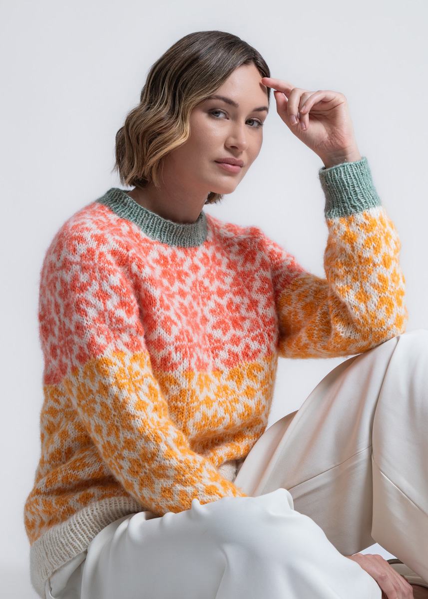 Rücken- und Vorderteil werden bis zu den Armausschnitten in Runden gestrickt und dann getrennt beendet. Die Ärmel werden ebenfalls bis zur Raglanschräge in Runden gestrickt. Das Modell hat eine Gesamtlänge von 61 (63 - 65 - 67 - 69 - 71) cm und eine Brustmehrweite von 15 cm bei 80 cm Brustumfang (16 cm bei 88 cm Brustumfang - 8 cm bei 96 cm Brustumfang - 10 cm bei 104 cm Brustumfang - 7 cm bei 116 cm Brustumfang - 5 cm bei 128 cm Brustumfang).