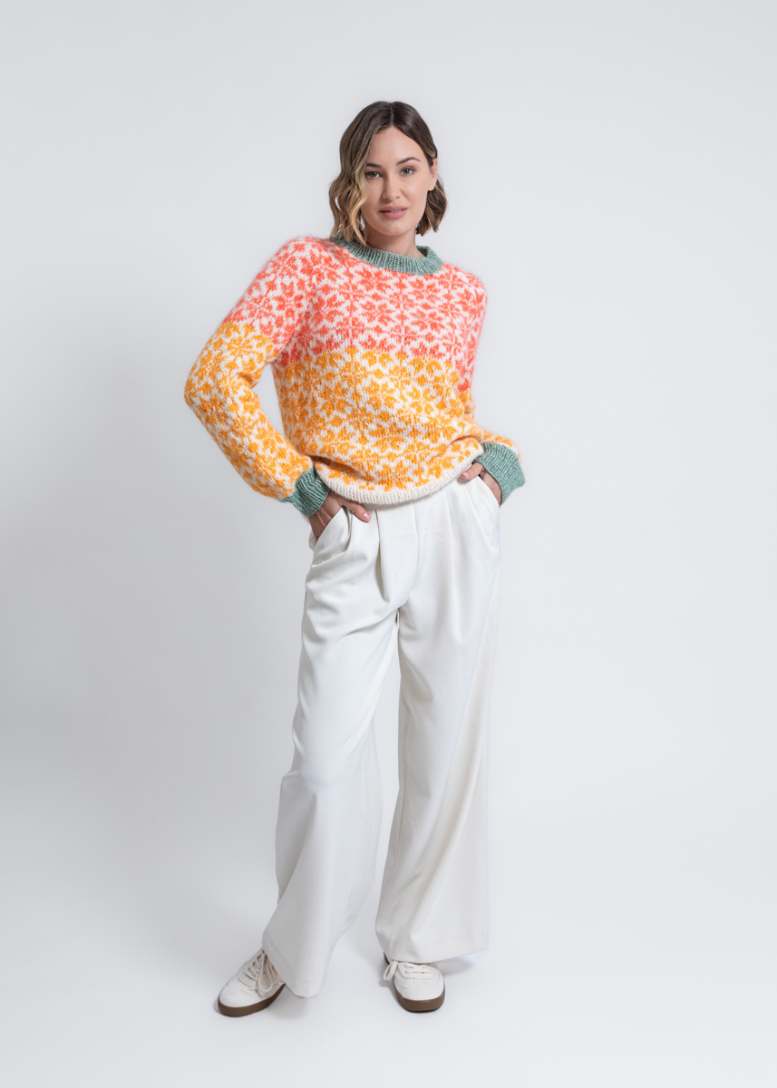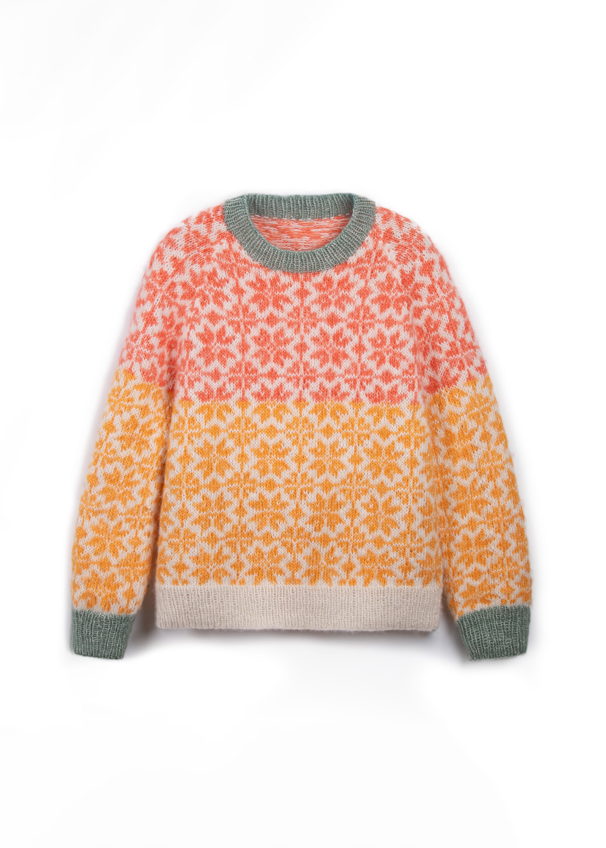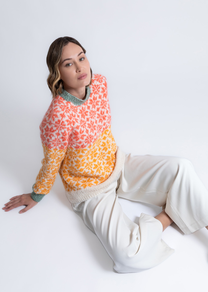 Rücken- und Vorderteil werden bis zu den Armausschnitten in Runden gestrickt und dann getrennt beendet. Die Ärmel werden ebenfalls bis zur Raglanschräge in Runden gestrickt. Das Modell hat eine Gesamtlänge von 61 (63 - 65 - 67 - 69 - 71) cm und eine Brustmehrweite von 15 cm bei 80 cm Brustumfang (16 cm bei 88 cm Brustumfang - 8 cm bei 96 cm Brustumfang - 10 cm bei 104 cm Brustumfang - 7 cm bei 116 cm Brustumfang - 5 cm bei 128 cm Brustumfang).