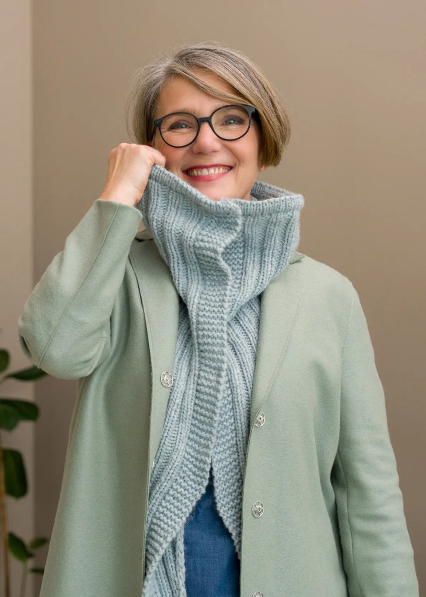 150g Alta Moda Cashmere 16 (Wollmischgarn mit Kettenstruktur (78%Schurwolle, 12 % Kaschmir, 10% Polyamid) mit 110m Lauflänge auf 50g) in Farbe 54 Pastellblau; 80-100 cm lange Rundstricknadel in Stärke Nr. 7 / 5 mm; für die doppelte Blende eine 80-100 cm lange Rundstricknadel, eine Stärke / ½ Stärke kleiner = Nr. 6 / 4,5 mm; 4-5 Druckknöpfe zum annähen und passendes Nähgarn oder eine Schmucknadel, Schere, Wollsticknadel zum Vernähen, Maßband.Wahlweise 90 cm Band oder Kordel für das Schlauchbündchen