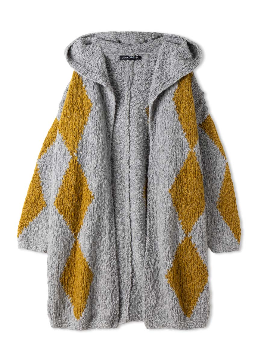 Riesige Rauten und ein voluminöses Noppengarn (neu) bilden die Basis für unser Duo aus Mantel und Schal. Starkes Detail: der angestrickte Kragen, der in einer großen Kapuze mündet.