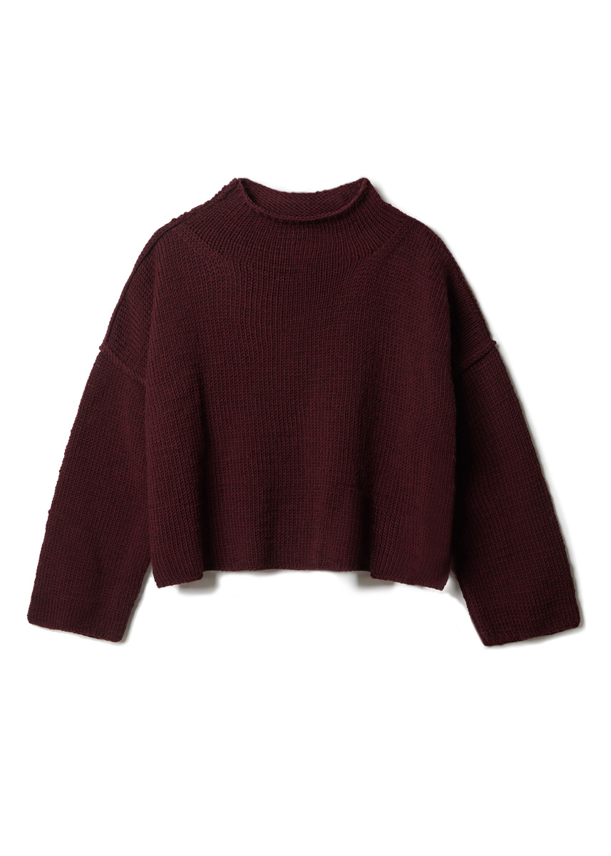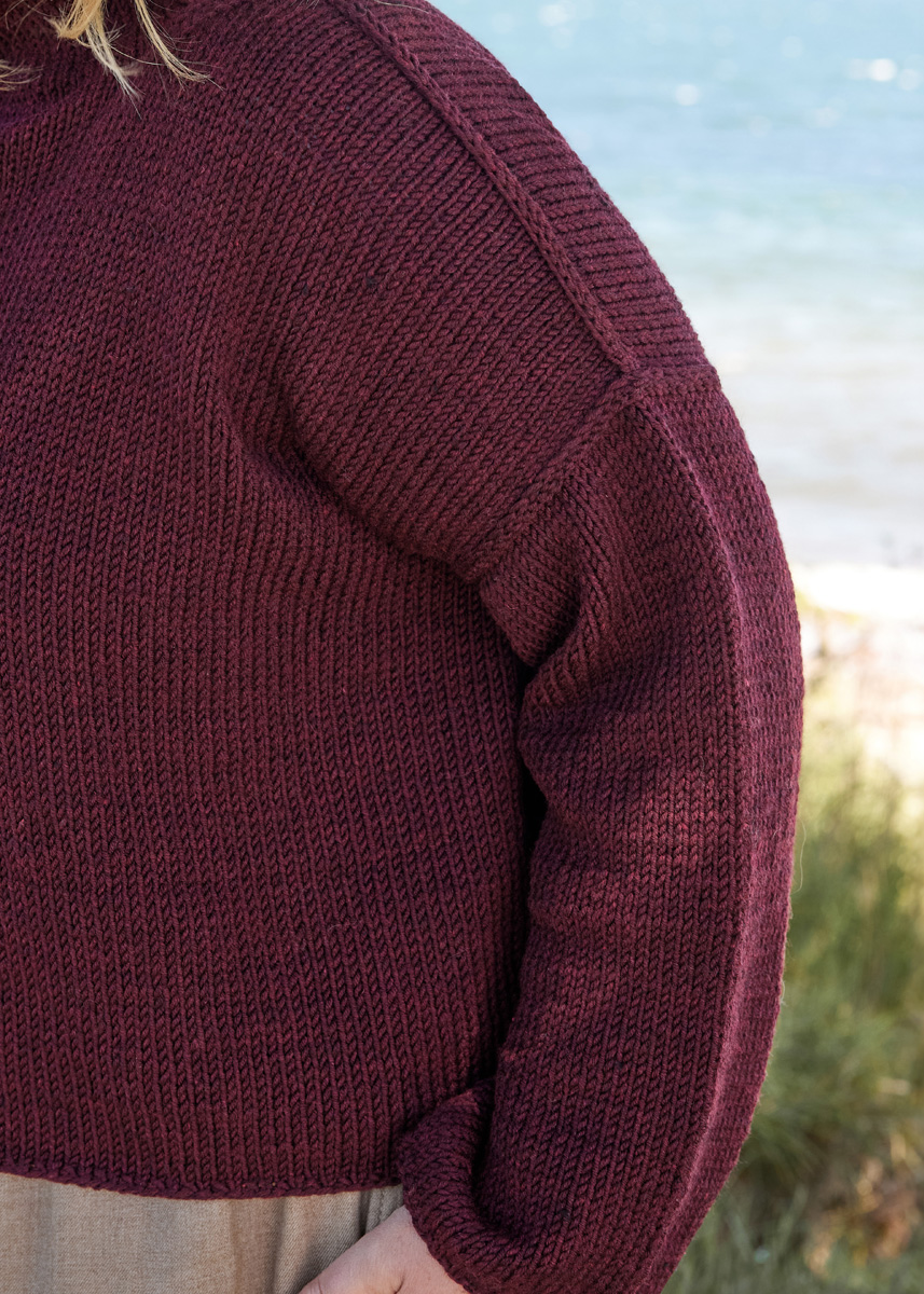 Lana Grossa Cool Wool Superbig Mélange (100% Schurwolle (Merino), LL = ca 80 m/50 g), 550 (600 - 650 - 700 - 750) g in Burgund meliert (Fb 203). Stricknd Nr. 5 und Nr 6. 1 Hilfs-Nd zum M stilllegen.