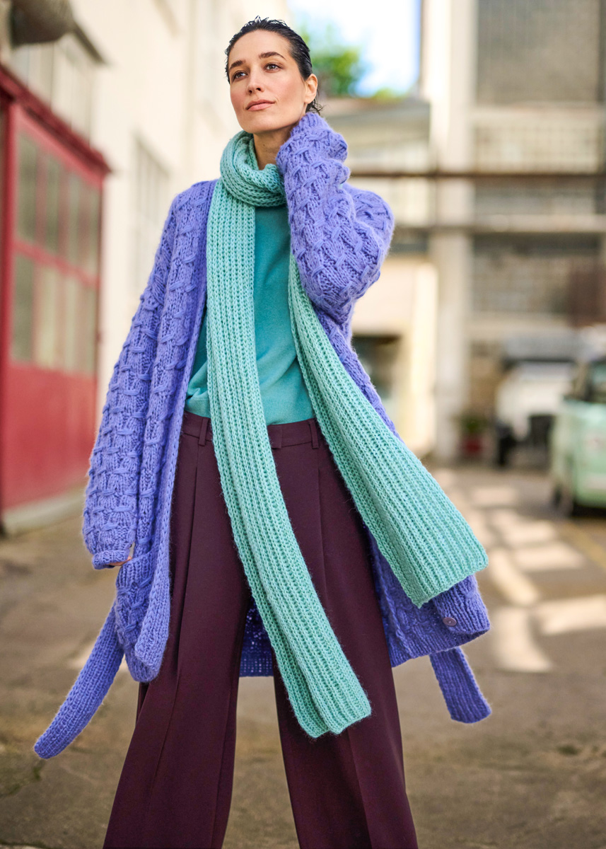 Garn von Lana Grossa, Qualität „Brigitte No. 2“ (47 % Alpaka (Baby), 45 % Baumwolle, 8 % Schurwolle (Merino), Lauflänge 140 m/ 50 g): je 200 g in Mint Nr. 76 oder Schokobraun Nr. 68. Stricknadeln 5 (wenn Sie locker stricken) oder 6 (wenn Sie fest stricken) – wichtig ist, dass Sie auf die Angaben in der Maschenprobe kommen.