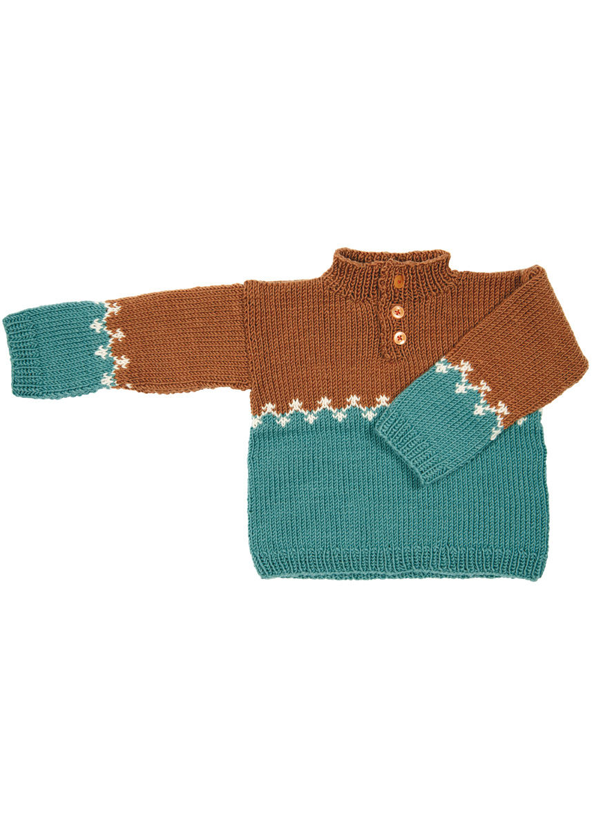 Lana Grossa Cool Wool (100 % Schurwolle (Merino), Lauflänge 160 m/50 g) 50 (100/100) g Mintblau (Fb 2048), 50 (100/100) g Karamell (Fb 2054) und 50 g Natur (Fb 590); Stricknadeln Nr. 4, eine 40 cm lange Rundstricknadel Nr. 4; drei Knöpfe mit 12 mm Ø.