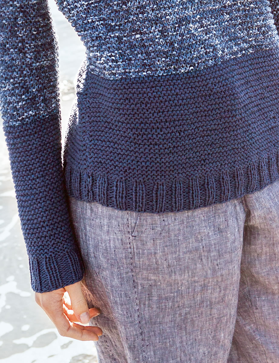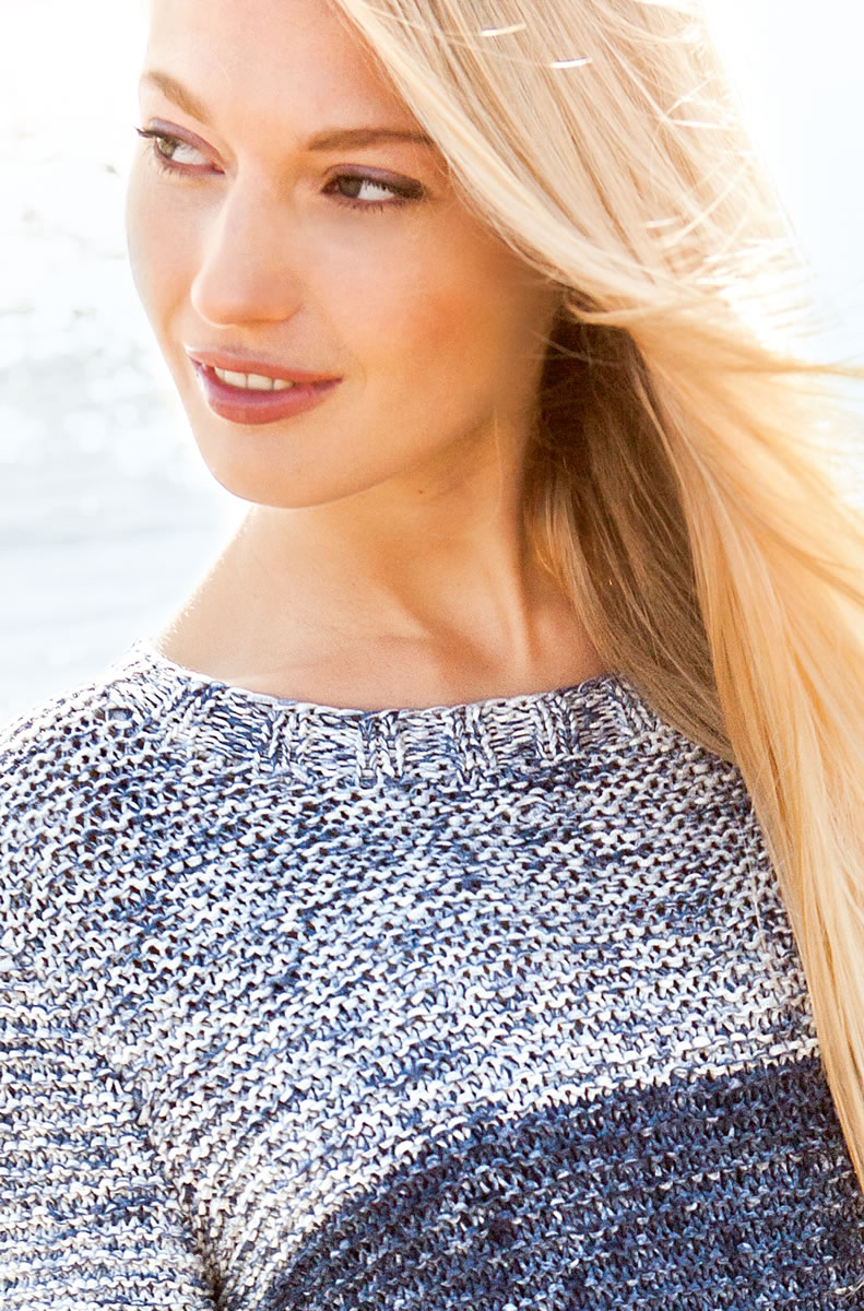 Lana Grossa „California” (80% Baumwolle,20%Seide,LL=100m/50g), Stricknadeln Nr. 4,5 und 5,5-6, eine Rund- stricknadel Nr. 4,5. Die Buchstaben A-C kennzeichnen die im Schnitt angegebene Reihenfolge: 150 (200) g Jeans/Natur (Fb 408 = c), je 200 (250) g Jeans (Fb 7 = A) und Jeansmeliert (Fb 208 = B).