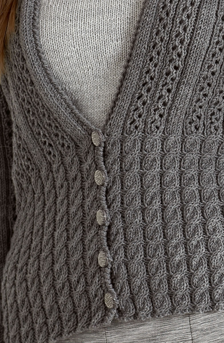 Lana Grossa-Qualität „Cool Wool” (100 % Schurwolle (Merino extrafine, filzfrei), LL = ca. 160 m/50 g): ca. 400 (450) g Hellgrau meliert (Fb. 443); Stricknadeln Nr. 3,5, je 1 Rundstricknadel Nr. 3 und 3,5, 60 cm lang.