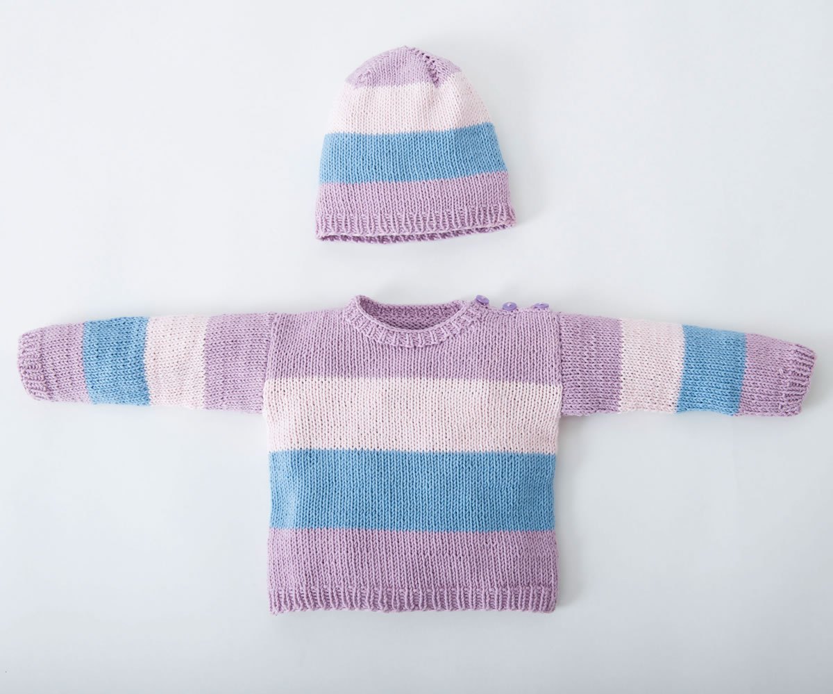 Lana Grossa Wakame (75 % Baumwolle, 25 % Viskose, Lauflänge 125 m/50 g) je 50 g Flieder (Fb 20), Zartrosa (Fb 19) und Hellblau (Fb 21); Stricknadeln Nr. 3,5, eine 40 cm lange Rundstricknadel Nr. 3,5, Spielstricknadel Nr. 3.5, Häkelnadel Nr. 3,5, drei Knöpfe.