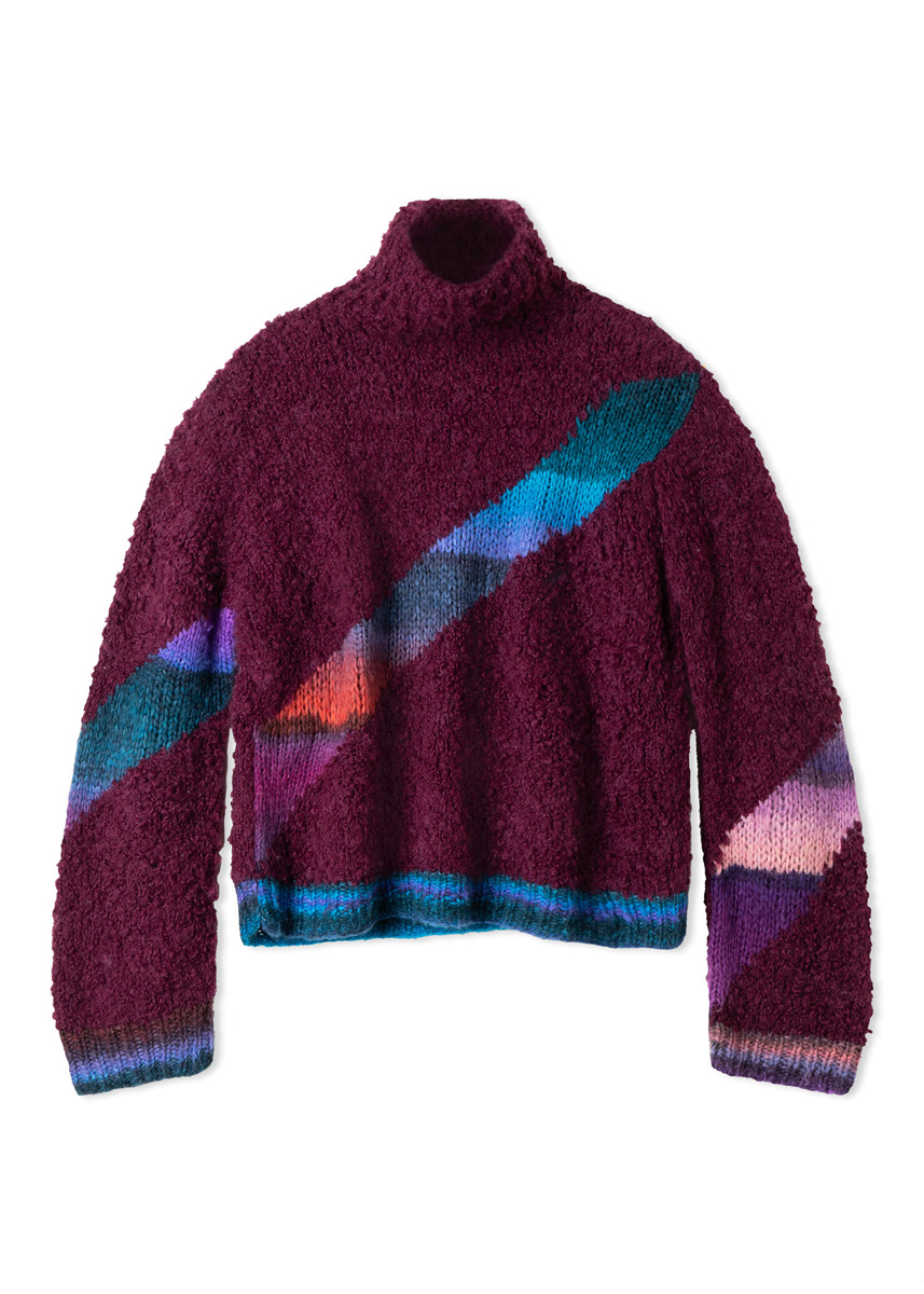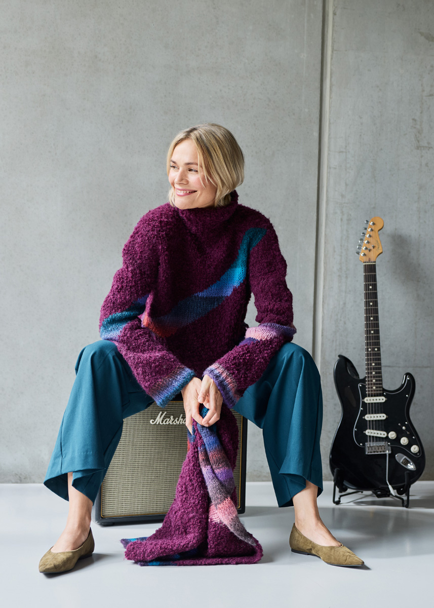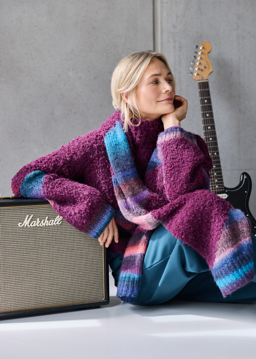 Lana Grossa-Qualität „Orsetto” (60 % Schurwolle (Merino), 40 % Alpaka (superfine), LL = ca. 75 m/50 g): ca. 300 (350 – 400) g Burgund (Fb. 5) und Lana Grossa- Qualität „Bomba” (85 % Schurwolle (Merino extrafine), 15 % Polyamid, LL = ca. 290 m/100 g): ca. 100 (200 – 200) g Lachs/Graurot/Dunkelviolett/ Türkisblau/Blaupetrol/Royal (Fb. 3); Stricknadeln Nr. 4 und 6, 1 Rundstricknadel Nr. 4, 40 cm lang.
