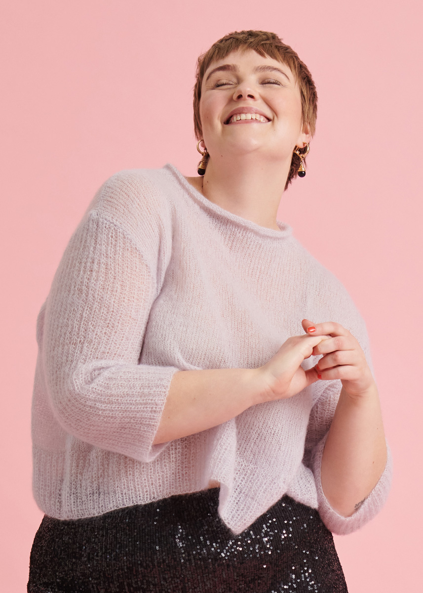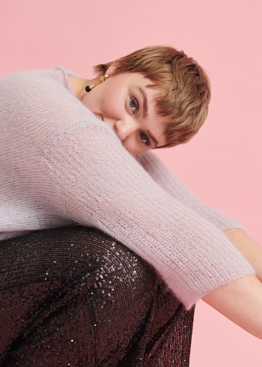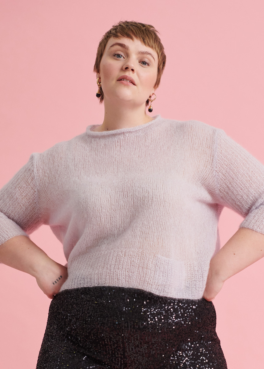 Lana Grossa-Qualität „Silkhair“ (70 % Mohair (Superkid), 30 % Seide, Lauflänge 210 m/25 g): ca. 175 (200 – 225) g Graulila (Fb. 152); Stricknadeln Nr. 3,5, 4 und 6, 1 Rundstricknadel Nr. 3,5, 50 cm lang.