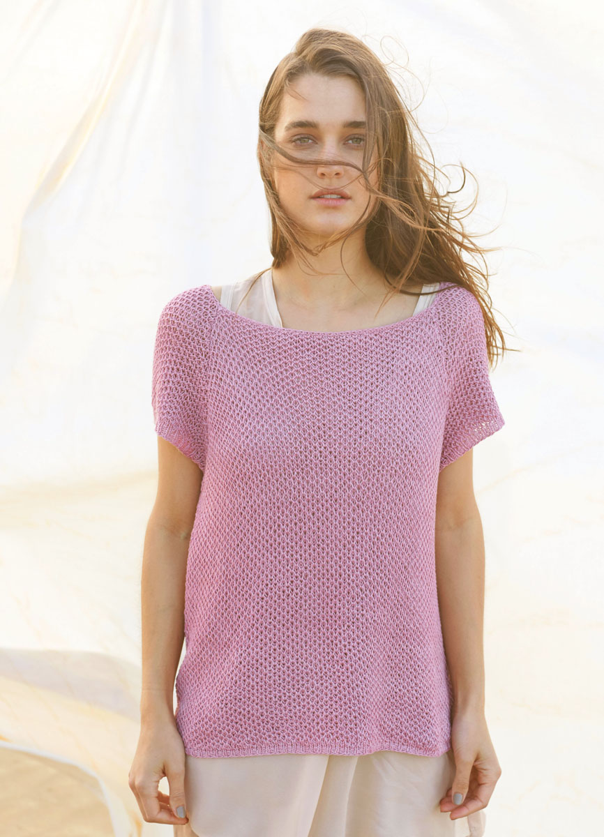 Lana Grossa Solo Lino (80 % recyceltes Leinen (Viskose), 20 % Leinen, Lauflänge 120 m/50 g) 400 (450-500) g Rosa (Fb 3); Stricknadeln Nr. 3,5 und 4, Häkelnadel Nr. 3,5.