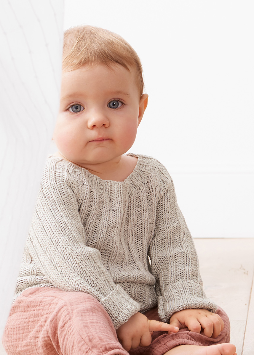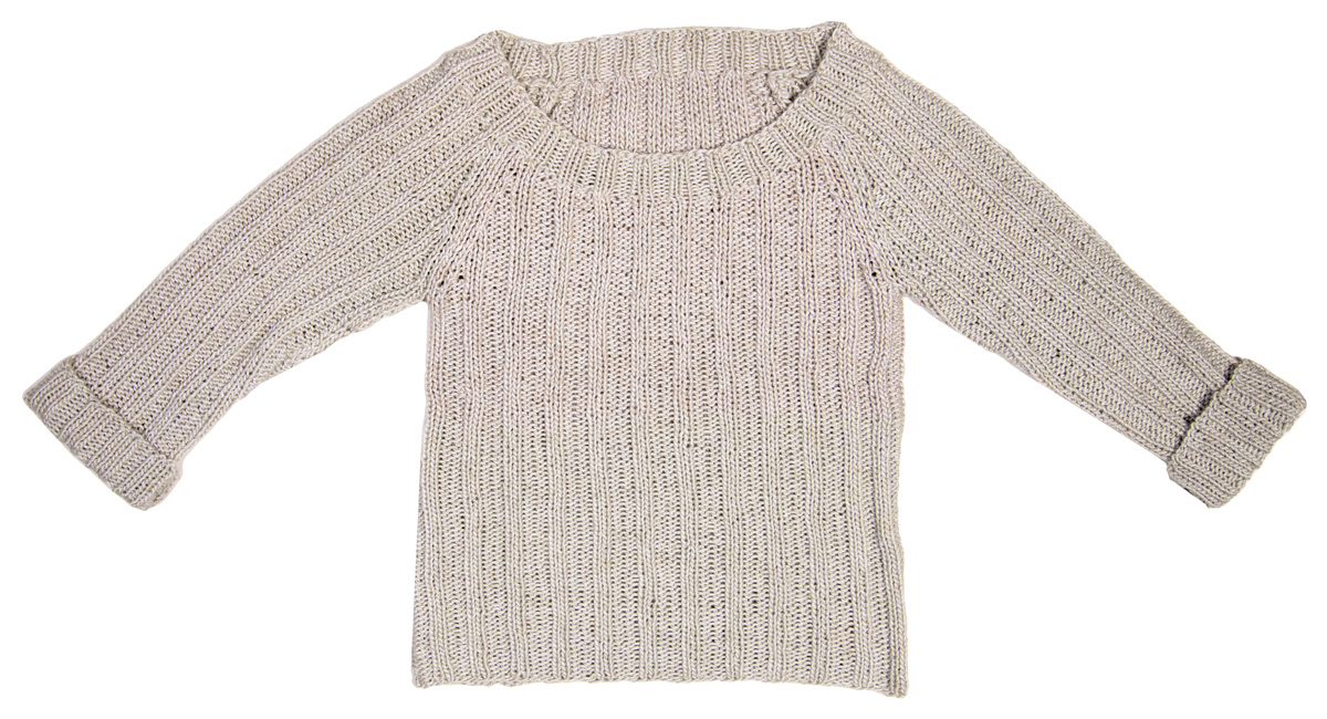 Lana Grossa Solo Lino (100 % Leinen, Lauflänge 120 m/50 g) 150 (200/250) g Grège (Fb 2); Stricknadeln Nr. 3,5, eine 40 cm lange Rundstricknadel Nr. 3,5.