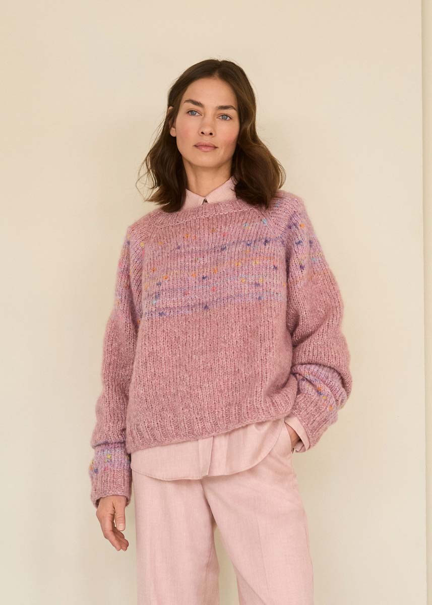 Lana Grossa-Qualität „Alpaca Air II“ (50 % Alpaca (Baby), 27 % Polyamid, 14 % Baumwolle, 9 % Schurwolle (Merino), LL = ca 140 m/50 g): 250 (250 - 300 - 300) g Altrosa (Fb 29), Lana Grossa-Qualität „Cassata“ (54 % Schurwolle (Merino extrafine), 30 % Polyamid, 16 % Baumwolle, LL = ca 175 m/50 g): 50 (100 - 100 - 100) g Zartlila/Rosa/Gelb/Lila (Fb 3); kurze und lange Rundstricknadel Nr 4,5 und 5,5; Nadelspiel Nr 4,5.