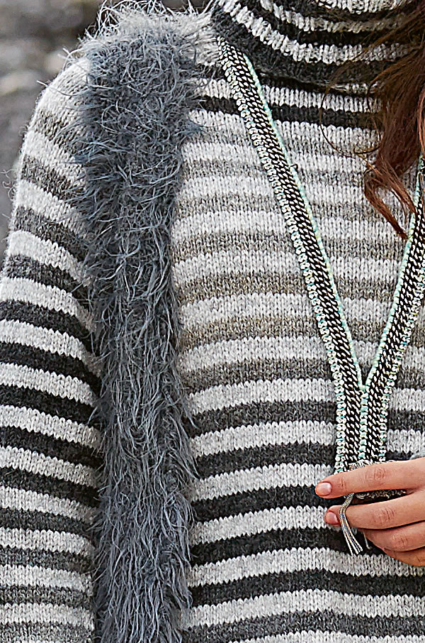 Lana Grossa Qualität „Alta Moda Superbaby Fine“ (63% Schurwolle Merino, 27% Baby Alpaca, 10 % Polyamid, LL = 105 m/25 g), ca. 150 (175) g Rohweiß/Hellgrau meliert (Fb 7) und Lana Grossa Qualität „Alta Moda Superbaby Fine Degradé“ (63% Schurwolle Merino, 27% Baby Alpaca, 10 % Polyamid, LL = 105 m/25 g), ca. 150 (175) g Mittel-/Dunkelgrau/Anthrazit (Fb 110), Stricknadeln Nr. 4,5 und 5, 1 kurze Rundstricknadel Nr. 5.