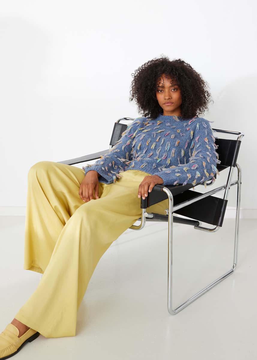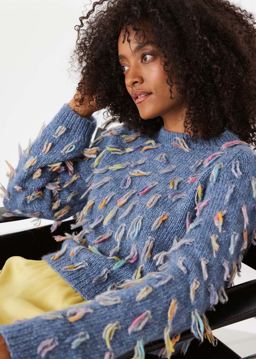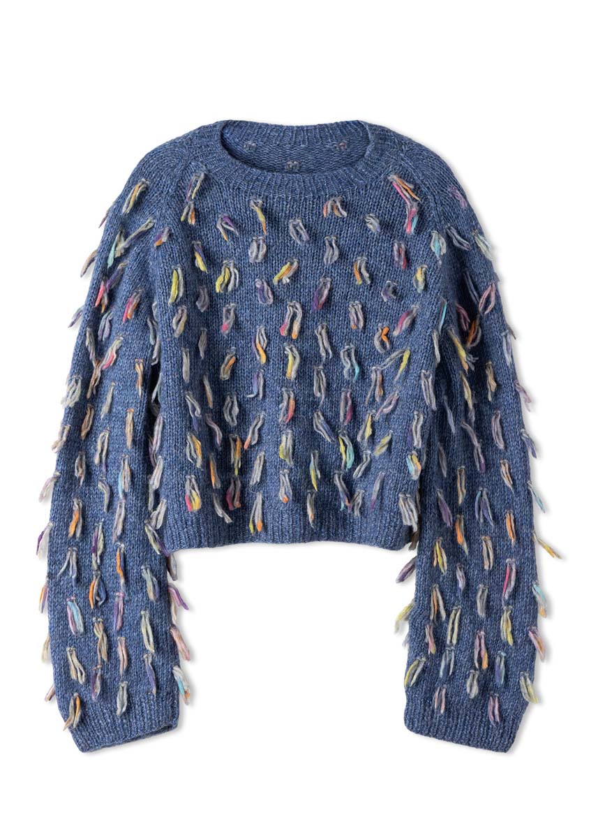 Klein, aber wow – der RAGLAN-PULLI mit bunten Fransen. Für den Effekt wird Print-Garn auf der Außenseite des Sweaters mitgeführt, in regelmäßigen Abständen verstrickt und später aufgeschnitten (siehe auch Modell 30).